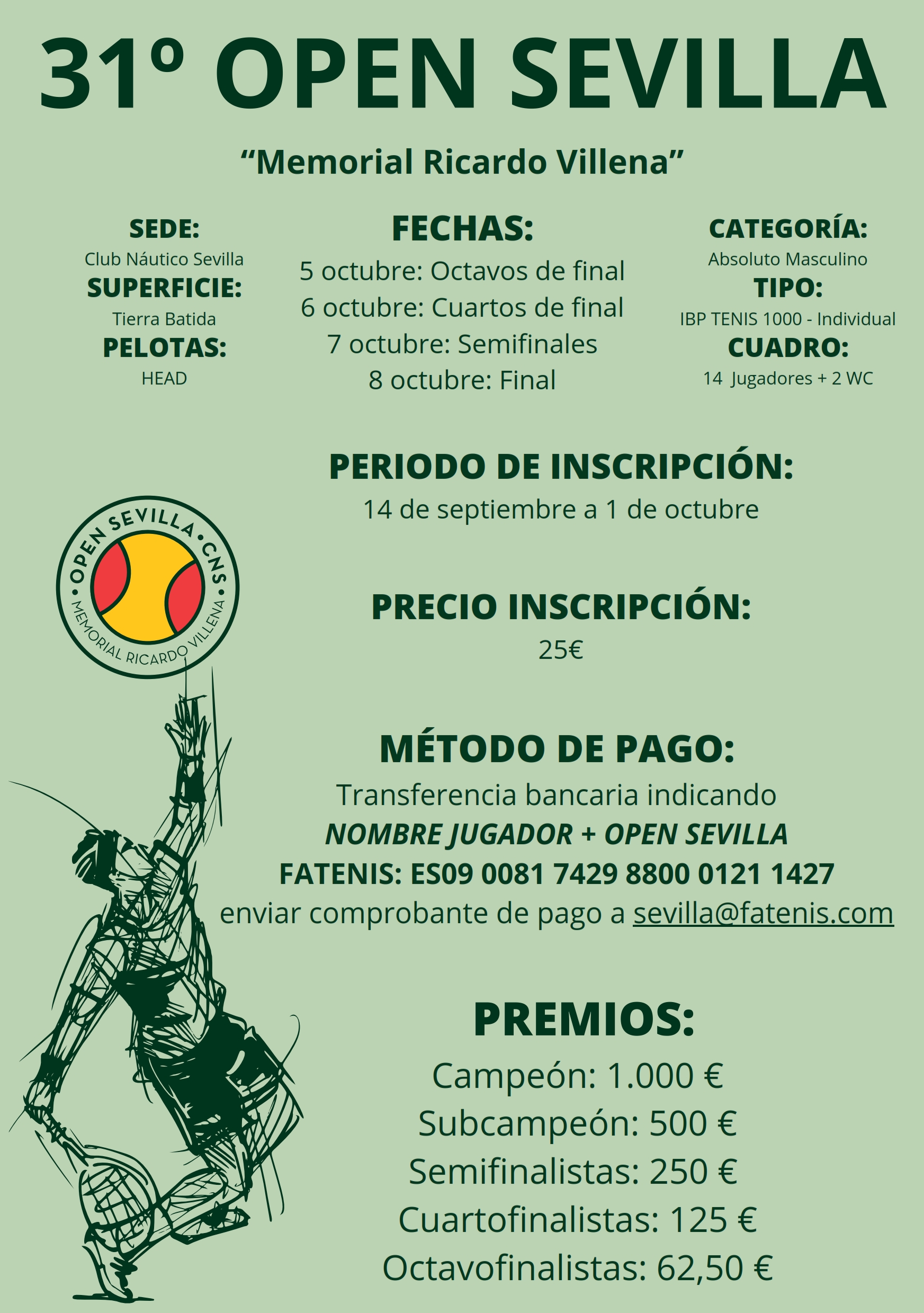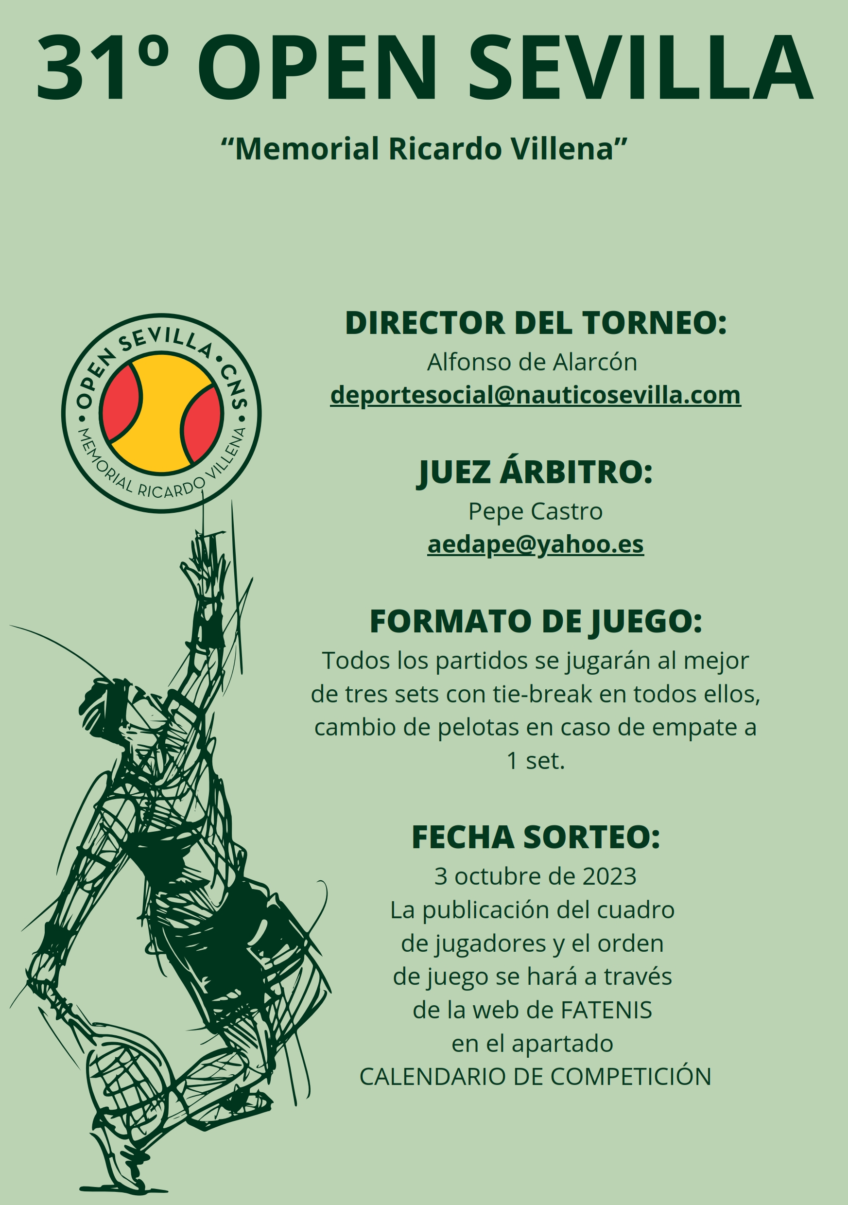 El Open Sevilla de tenis Memorial Ricardo Villena vuelve a entrar en escena un nuevo año como prueba incluida en el calendario de la Federación Andaluza. La edición número 31, a disputar en las nuevas pistas de tierra batida del Club Náutico Sevilla del 5 al 8 de octubre como cita puntuable para el ránking nacional y el IBP Tenis en la categoría 1.000, ya ha abierto su plazo de inscripción.