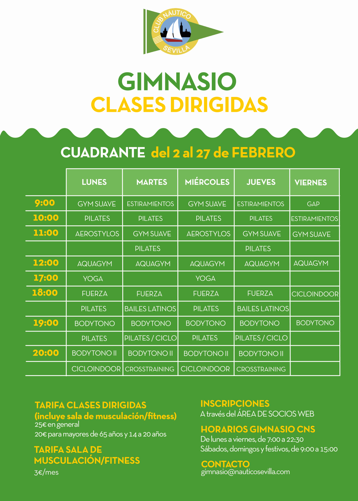 Inscripciones, incluyendo acceso a sala de musculación/fitness, a través del ÁREA DE SOCIOS WEB (inscripción en clases) con cuota de 25€ en general y de 20€ para mayores de 65 años y el tramo de 14 a 20 años, reservando las actividades por medio de la APP MyWellness hasta 15 días antes, sin ninguna limitación de clases.