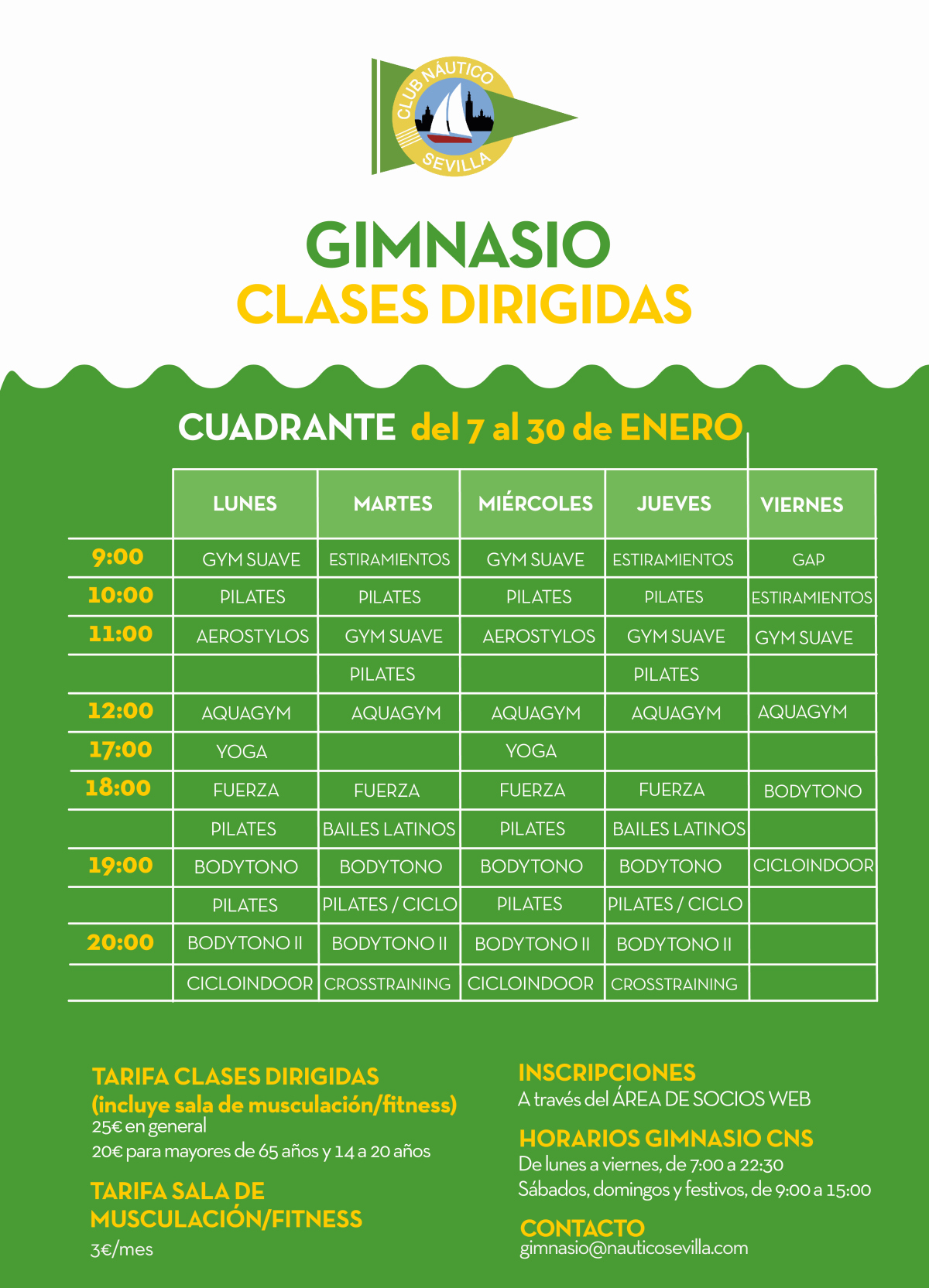De lunes a viernes de 9:00 a 21:30 horas, clases de Pilates, estiramientos, aerostylos, aquagym, yoga, gimnasia suave, bailes latinos, cicloindoor, bodytono, GAP, fuerza y crosstraining.