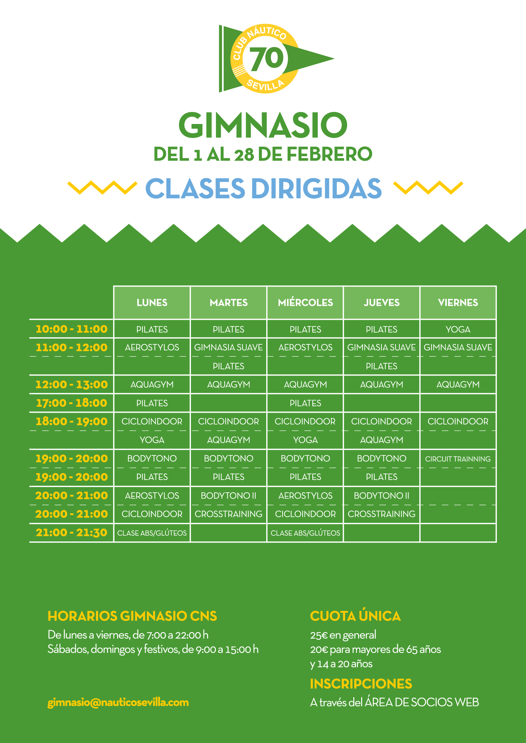 De lunes a viernes, de 10:00 a 21:30 horas, clases de Pilates, yoga, aerostylos, gimnasia suave, aquagym, cicloindoor, bodytono, Masterclass, crosstrainning y ABS/glúteos.