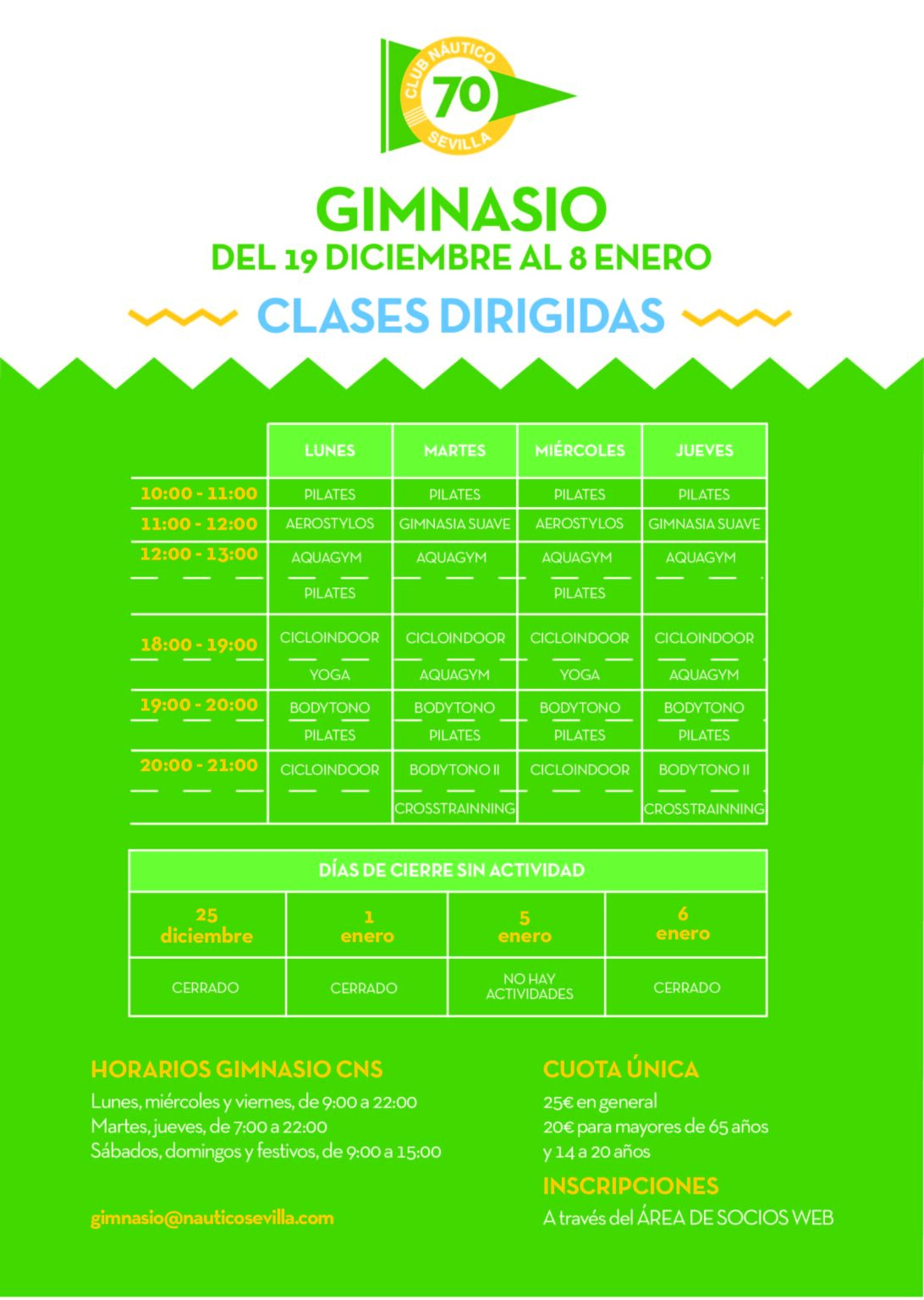 De lunes a jueves, de 10:00 a 21:30 horas, clases de Pilates, yoga, aerostylos, gimnasia suave, aquagym, cicloindoor, bodytono y crosstrainning. Inscripciones, a través del ÁREA DE SOCIOS WEB (enlace), con cuota de 25€ en general y de 20€ para mayores de 65 años y el tramo de 14 a 20 años.