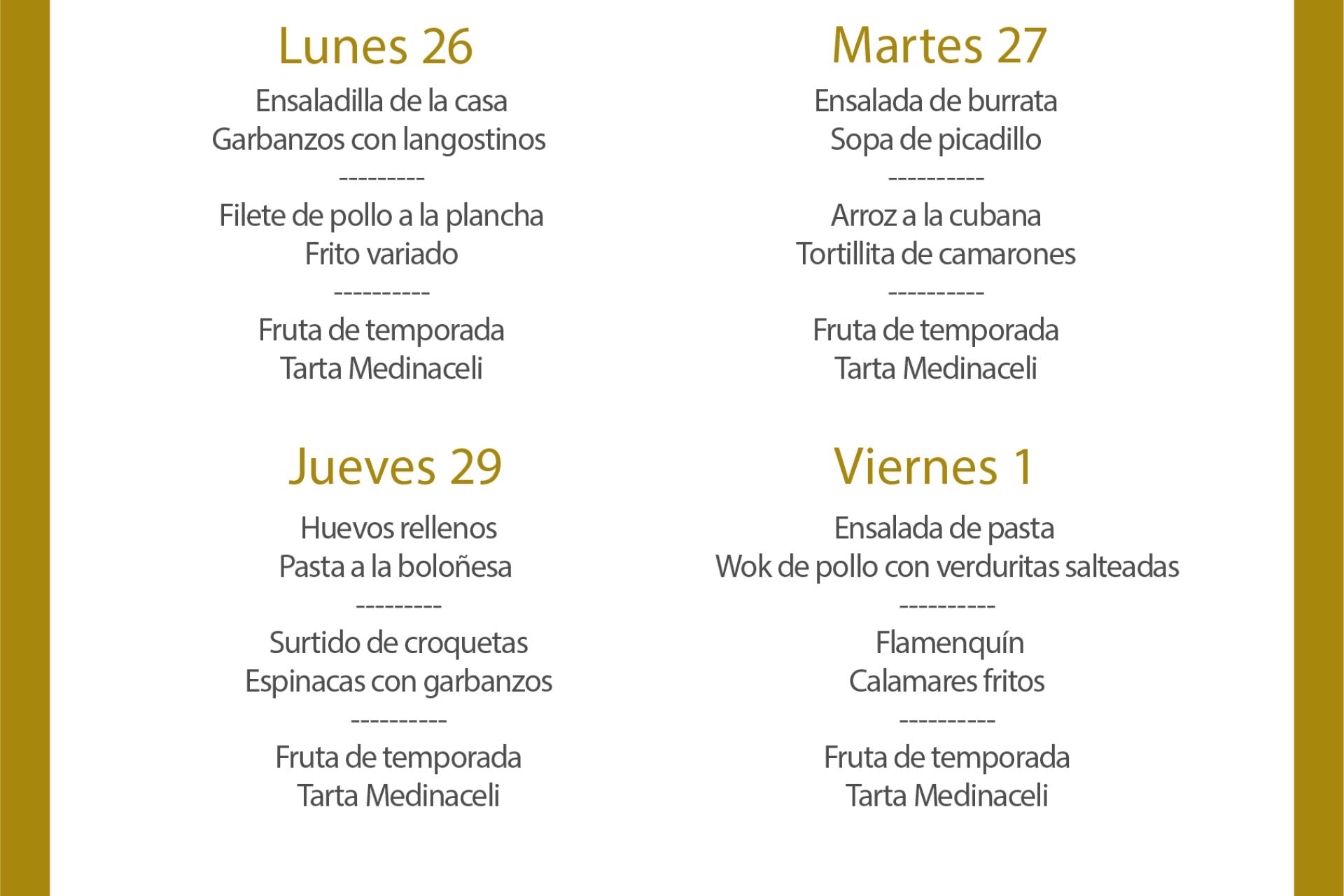 Menú disponible a mediodía del lunes 26 de febrero al viernes 1 de marzo en la planta alta del salón social al precio de 9€/persona (IVA, pan/picos y una bebida incluidos). Miércoles 28, festivo, no disponible.