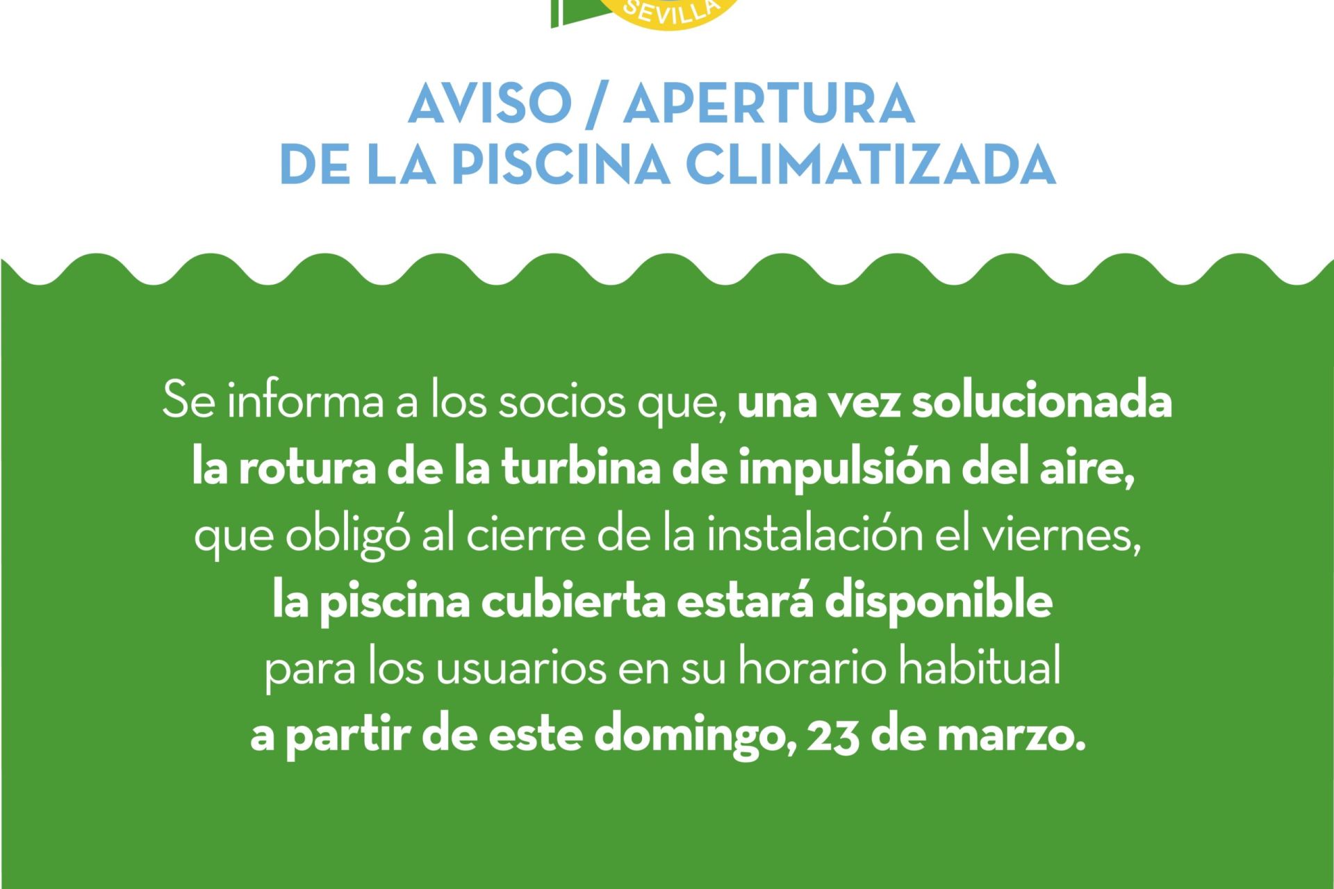 Se informa a los socios que, una vez solucionada la rotura de la turbina de impulsión del aire, que obligó al cierre de la instalación el viernes, la piscina cubierta estará disponible para los usuarios en su horario habitual a partir de este domingo, 23 de marzo.