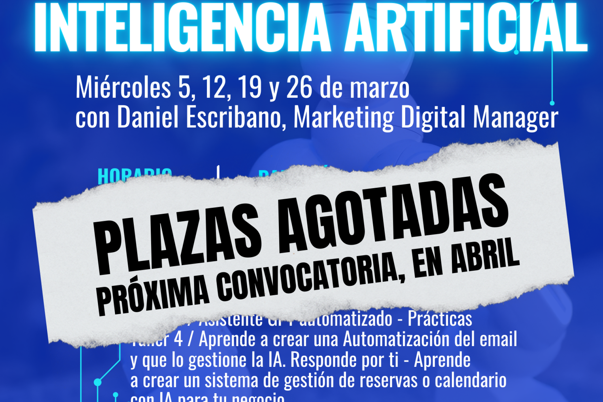Este miércoles, 12 de marzo, de 19:00 a 20:30 h en el Pabellón infantil del Club Náutico, segunda sesión de los talleres de IA con Daniel Escribano, Marketing Digital Manager, con plazas agotadas y que tendrán nueva convocatoria en el mes de abril.