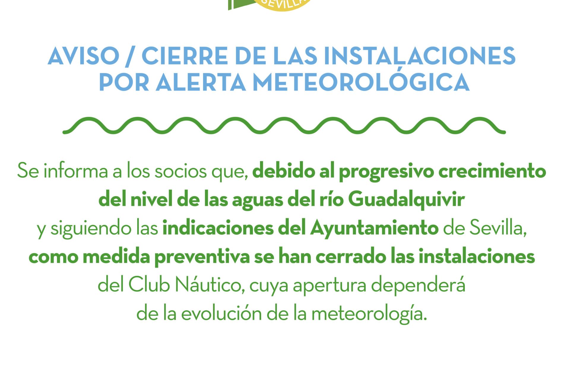Se informa a los socios que, debido al progresivo crecimiento del nivel de las aguas del río Guadalquivir y las indicaciones del Ayuntamiento de Sevilla, como medida preventiva se han cerrado las instalaciones del Club Náutico, cuya apertura dependerá de la evolución de la meteorología.