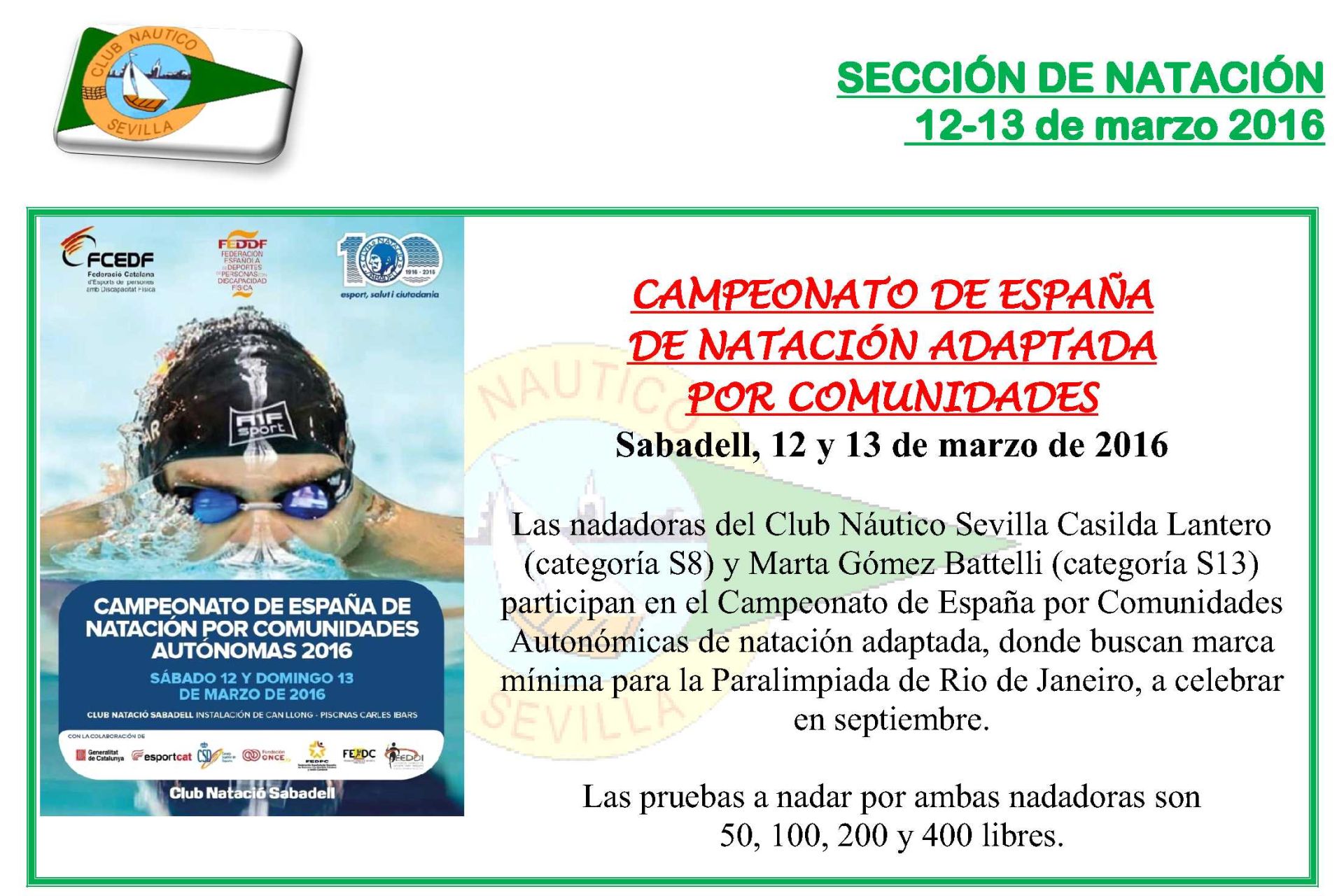 El Club Náutico Sevilla ha logrado un total de ocho medallas (dos oros, tres plata y tres bronces) en los Campeonatos de España de natación adaptada por comunidades, disputados este fin de semana en Sabadell. A la cita acudía el club hispalense con Marta Gómez Battelli (categoría S13) y Casilda Lantero (S8), que sólo dejaron escapar una de las opciones de medalla en las nueve pruebas disputadas.