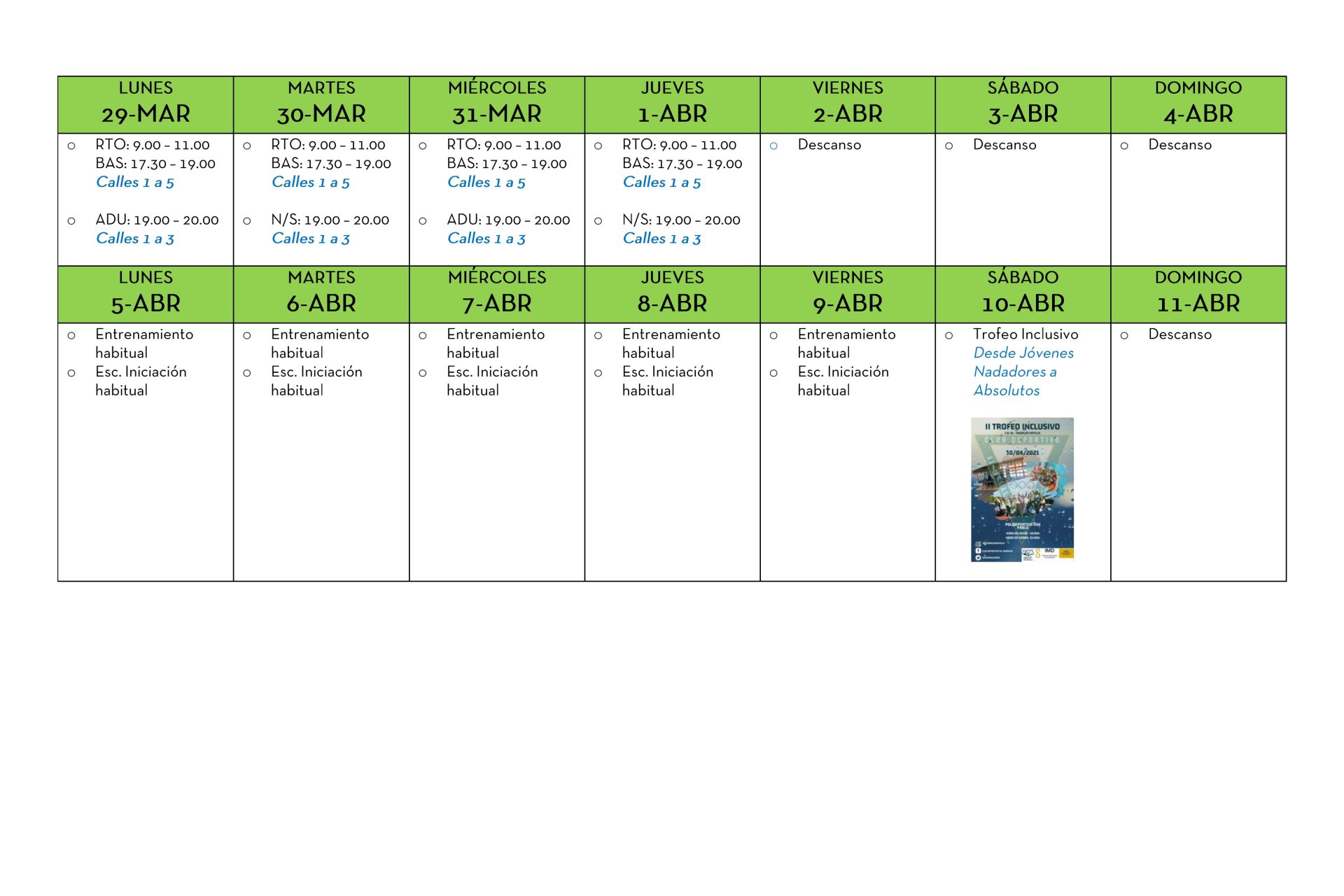 Cuadrante de horarios de las Escuelas de iniciación y base, del Grupo de rendimiento, adultos y el programa Natación y salud.