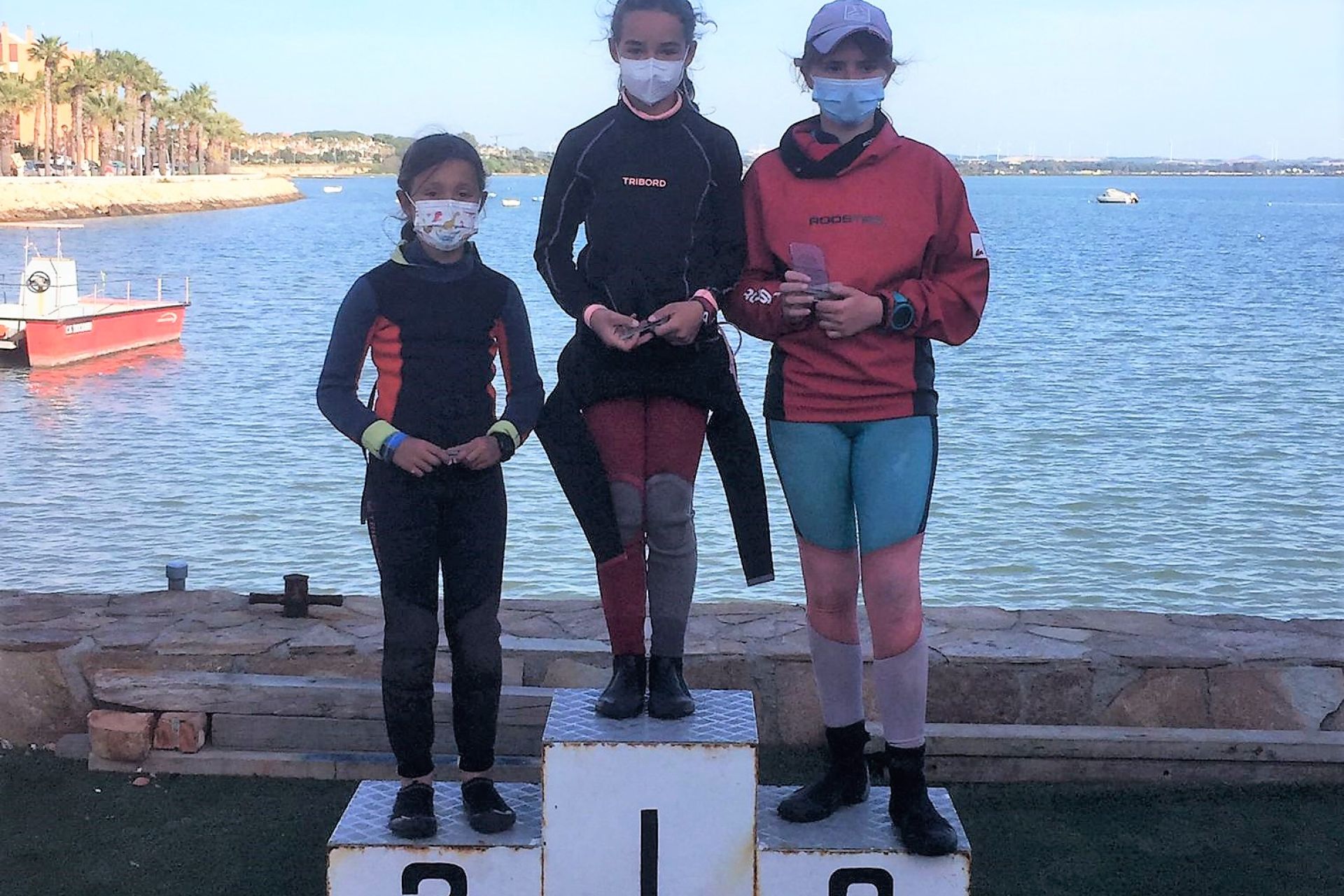 Pleno para el Club Náutico Sevilla en el podio femenino sub13 de la cita disputada en Puerto Real con Elena Delgado, Mercedes Medel y Beatriz Serrano.