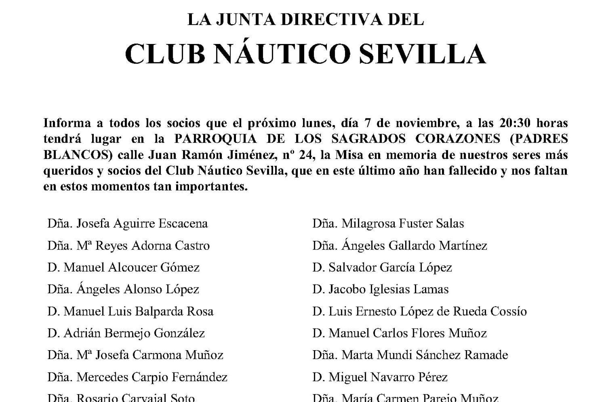 El presidente y la Junta Directiva del Club Náutico Sevilla ruegan a sus socios que asistan a la Santa Misa que se celebrará el miércoles 18 de noviembre a las 20:30 horas en la Capilla de los marineros (calle Pureza, 51), con un aforo máximo 46 personas, por el eterno descanso de las almas de sus socios difuntos, especialmente por los fallecidos en el año último:
