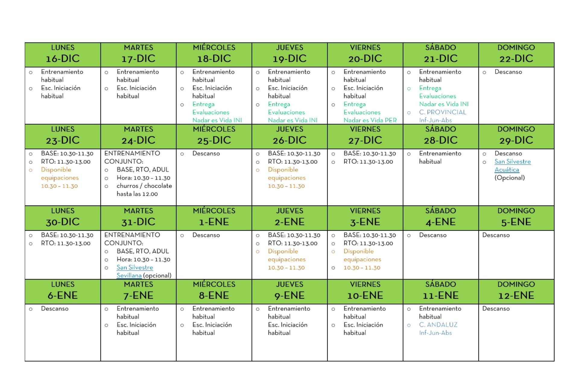 Actualización de horarios de entrenamientos en Navidad para los diferentes grupos de la sección de natación del Club Náutico.