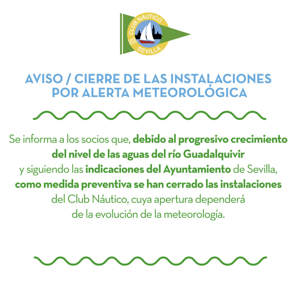 Se informa a los socios que, debido al progresivo crecimiento del nivel de las aguas del río Guadalquivir y las indicaciones del Ayuntamiento de Sevilla, como medida preventiva se han cerrado las instalaciones del Club Náutico, cuya apertura dependerá de la evolución de la meteorología.