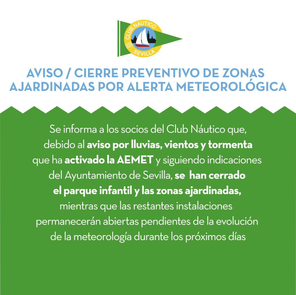 Se informa a los socios del Club Náutico que, debido al aviso por lluvias, vientos y tormenta que ha activado la AEMET y siguiendo indicaciones del Ayuntamiento de Sevilla, se han cerrado el parque infantil y las zonas ajardinadas, mientras que las restantes instalaciones permanecerán abiertas pendientes de la evolución de la meteorología durante los próximos días.