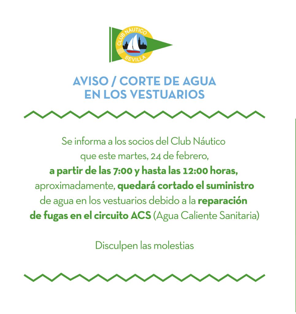 Se informa a los socios del Club Náutico que este martes, 24 de febrero, a partir de las 7:00 y hasta las 12:00 horas, aproximadamente, quedará cortado el suministro de agua en los vestuarios debido a la reparación de fugas en el circuito ACS (Agua Caliente Sanitaria). Disculpen las molestias.