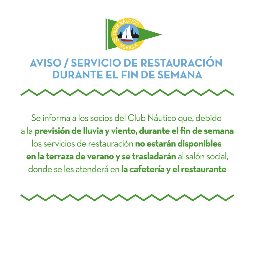 Se informa a los socios del Club Náutico que, debido a la previsión de lluvia y viento, durante el fin de semana los servicios de restauración no estarán disponibles en la terraza de verano y se trasladarán al salón social, donde se les atenderá en la cafetería y el restaurante.