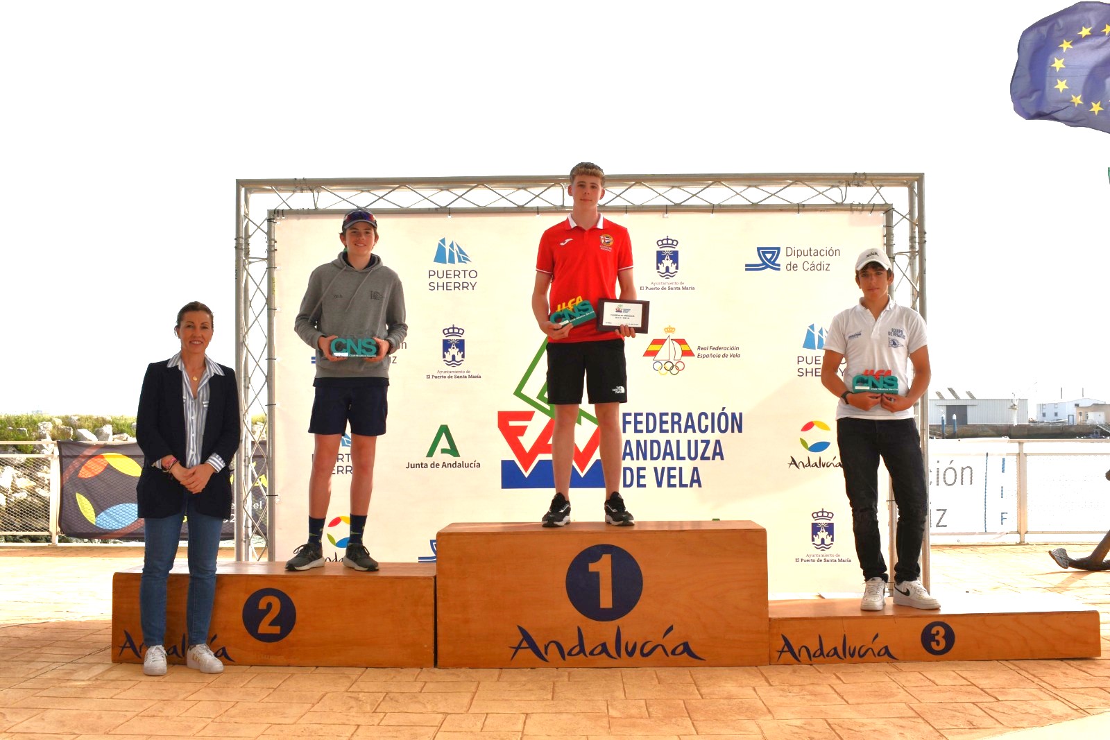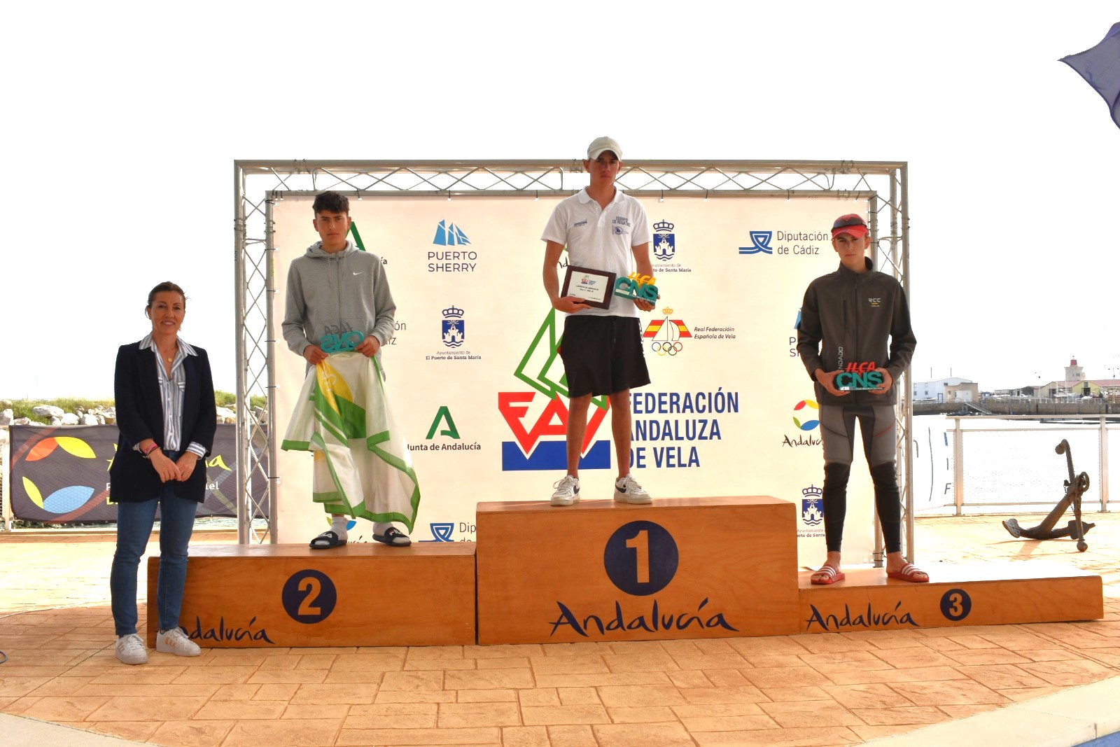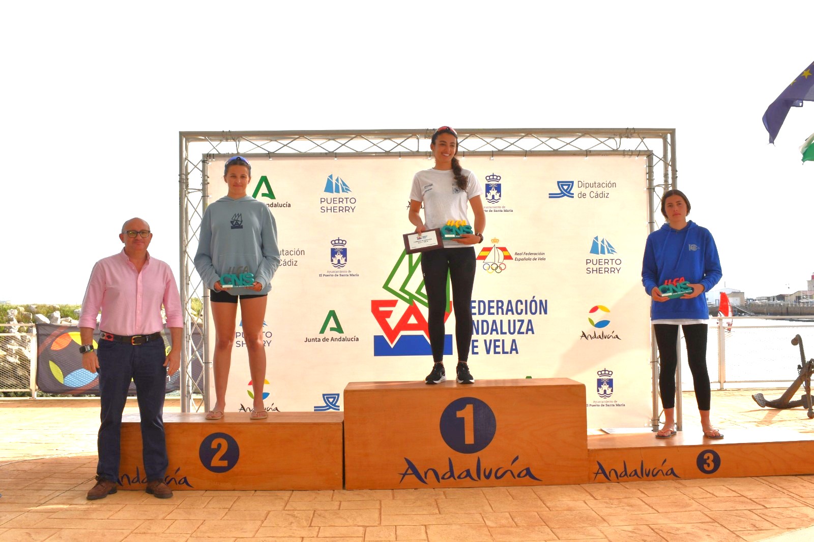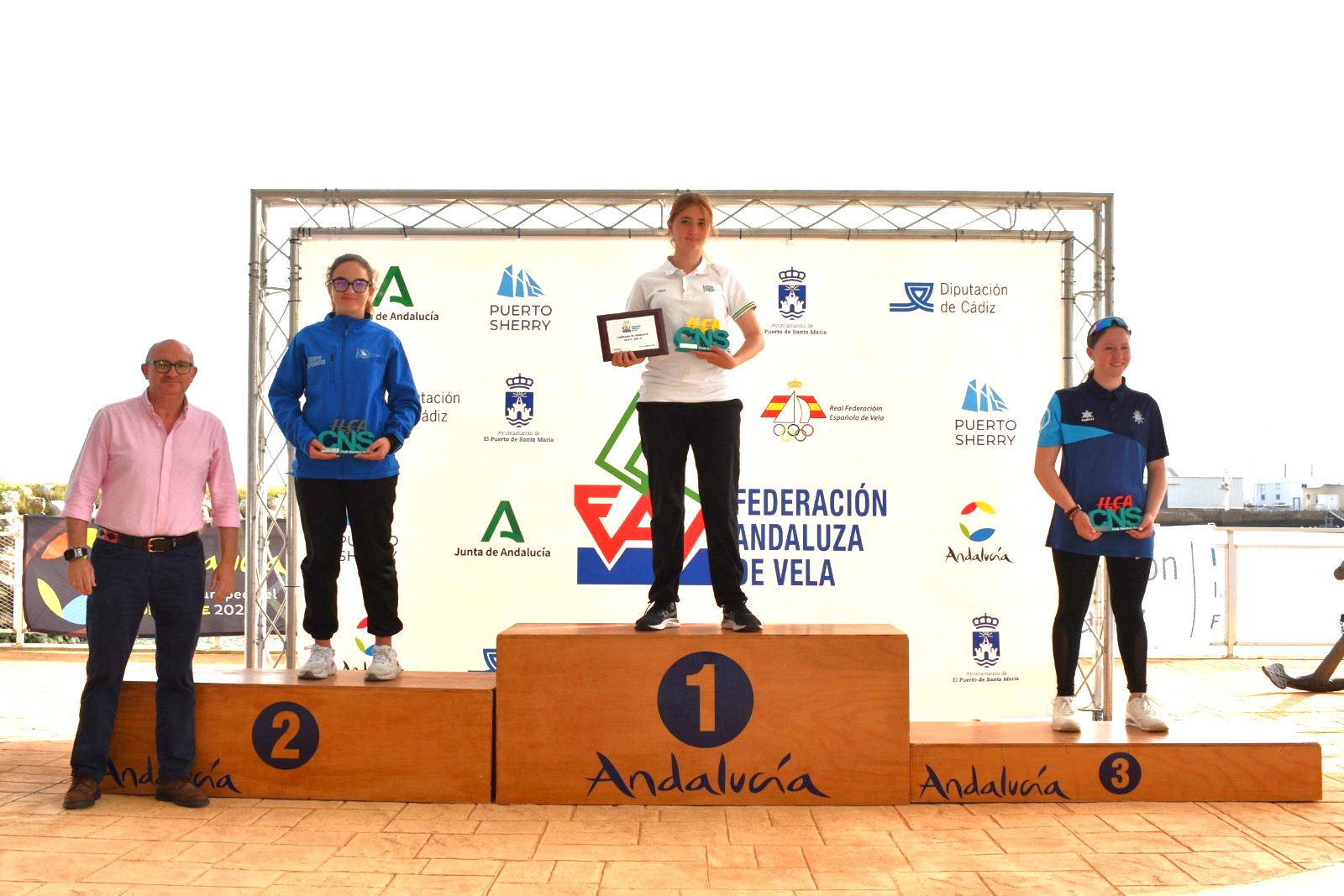 Cuatro podios para la flota del Club Náutico Sevilla, organizador de la cita regional en El Puerto de Santa María, con Beatriz Serrano (1ª sub16), Alberto Medel (2º sub18), Alfonso Murube (2º sub16) y Mercedes Medel (3ª sub18).