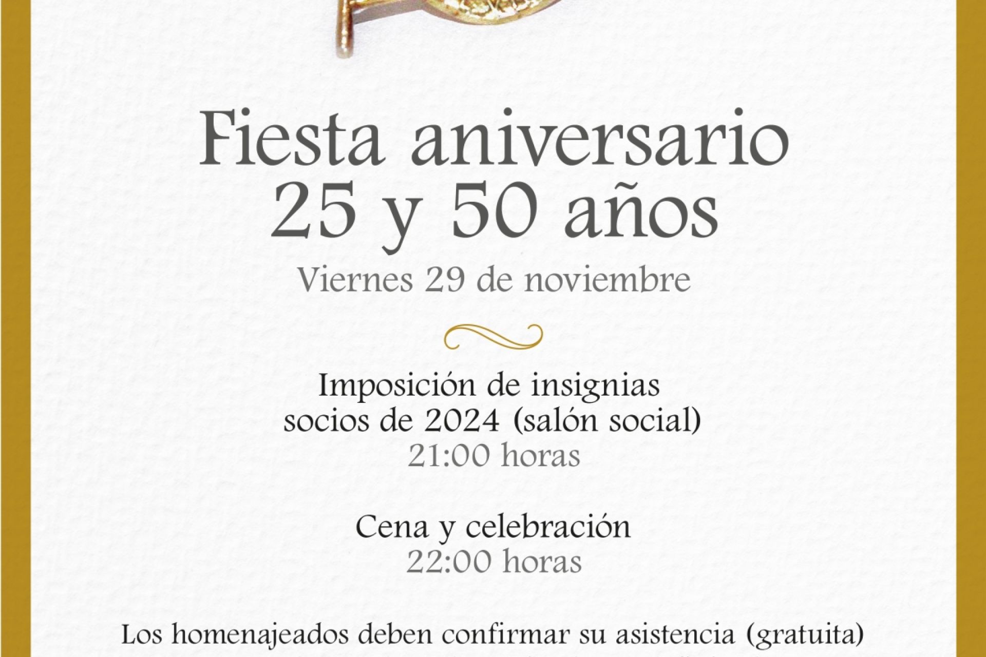 Ampliada hasta el lunes 25 de noviembre, inclusive, la reserva de invitaciones para el acto programado el viernes 29 para distinguir a los socios que han cumplido sus bodas de oro y plata con la entidad en 2024 (promociones de 1974 y 1999). Los socios homenajeados deben confirmar su asistencia (gratuita) en Secretaría y definir el número de  acompañantes, que tienen que abonar y retirar sus invitaciones (50€/persona) en la Cafetería/Restaurante.