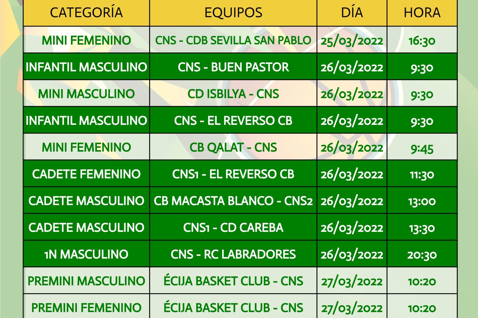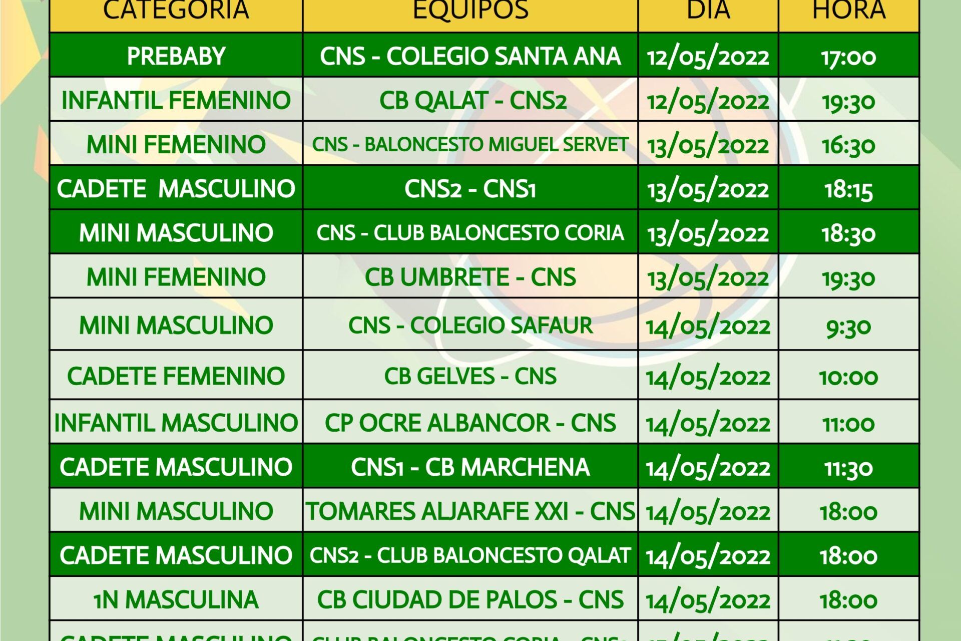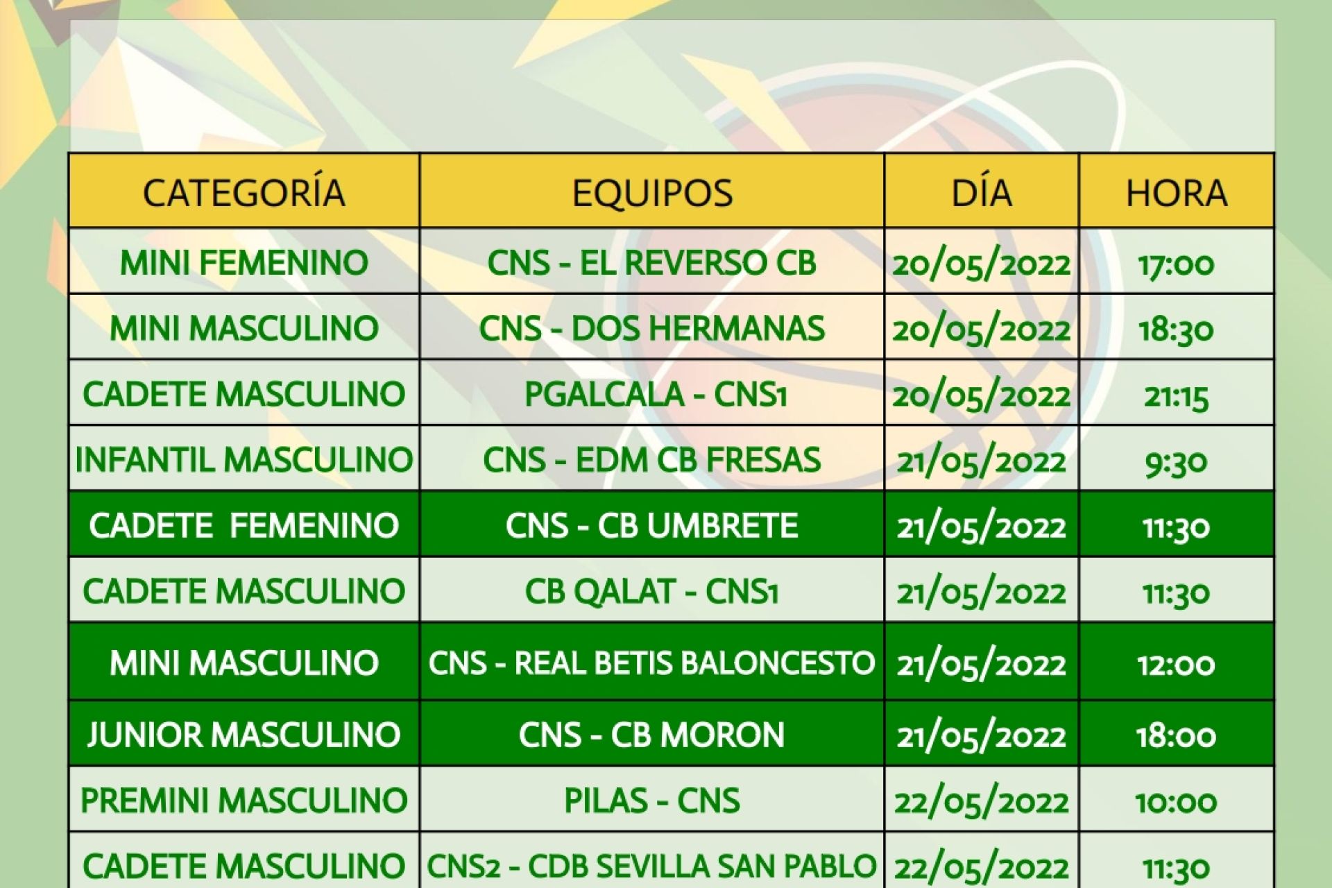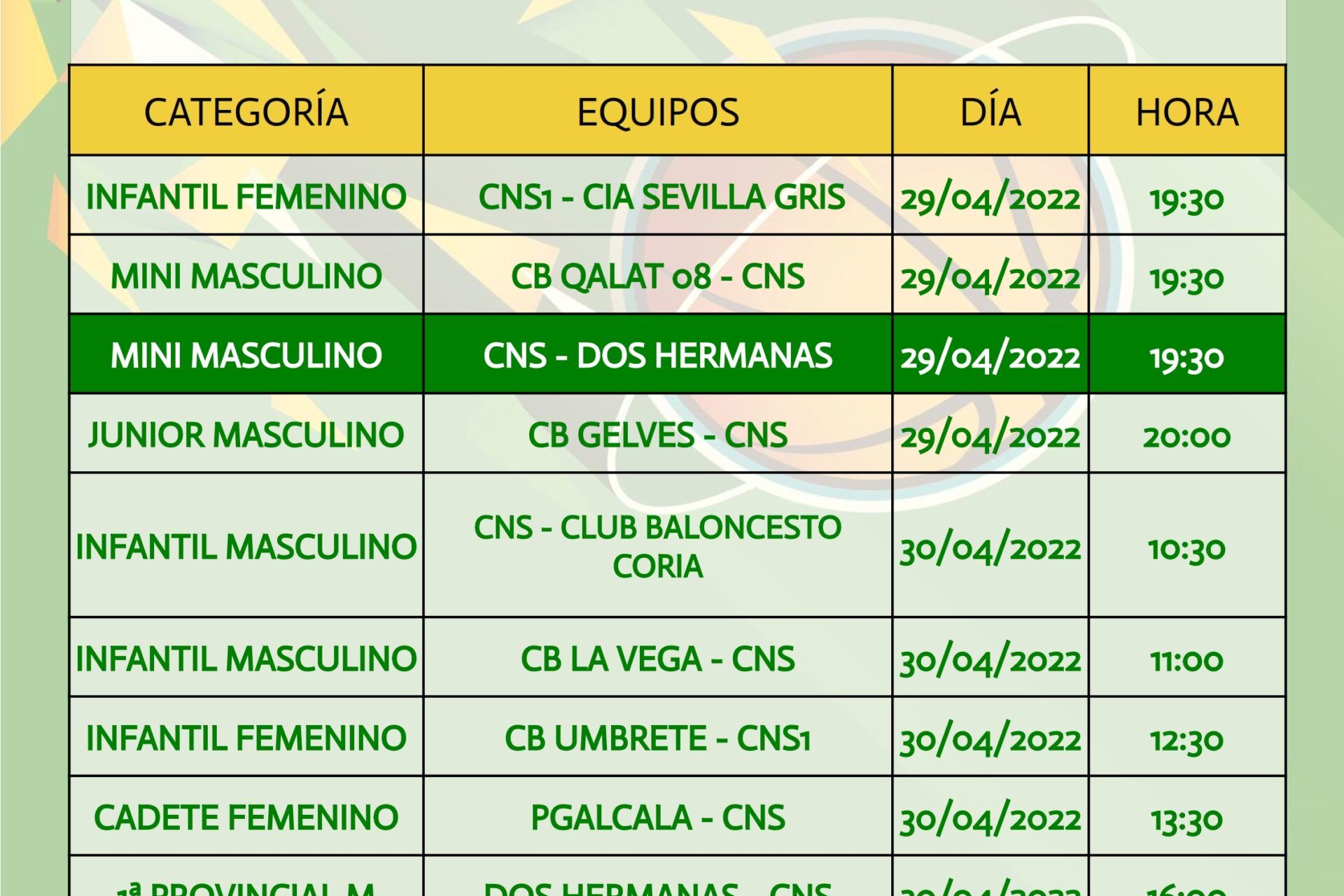 Partidos a disputar por los diferentes equipos del Club Náutico Sevilla del 29 de abril al 1 de mayo.