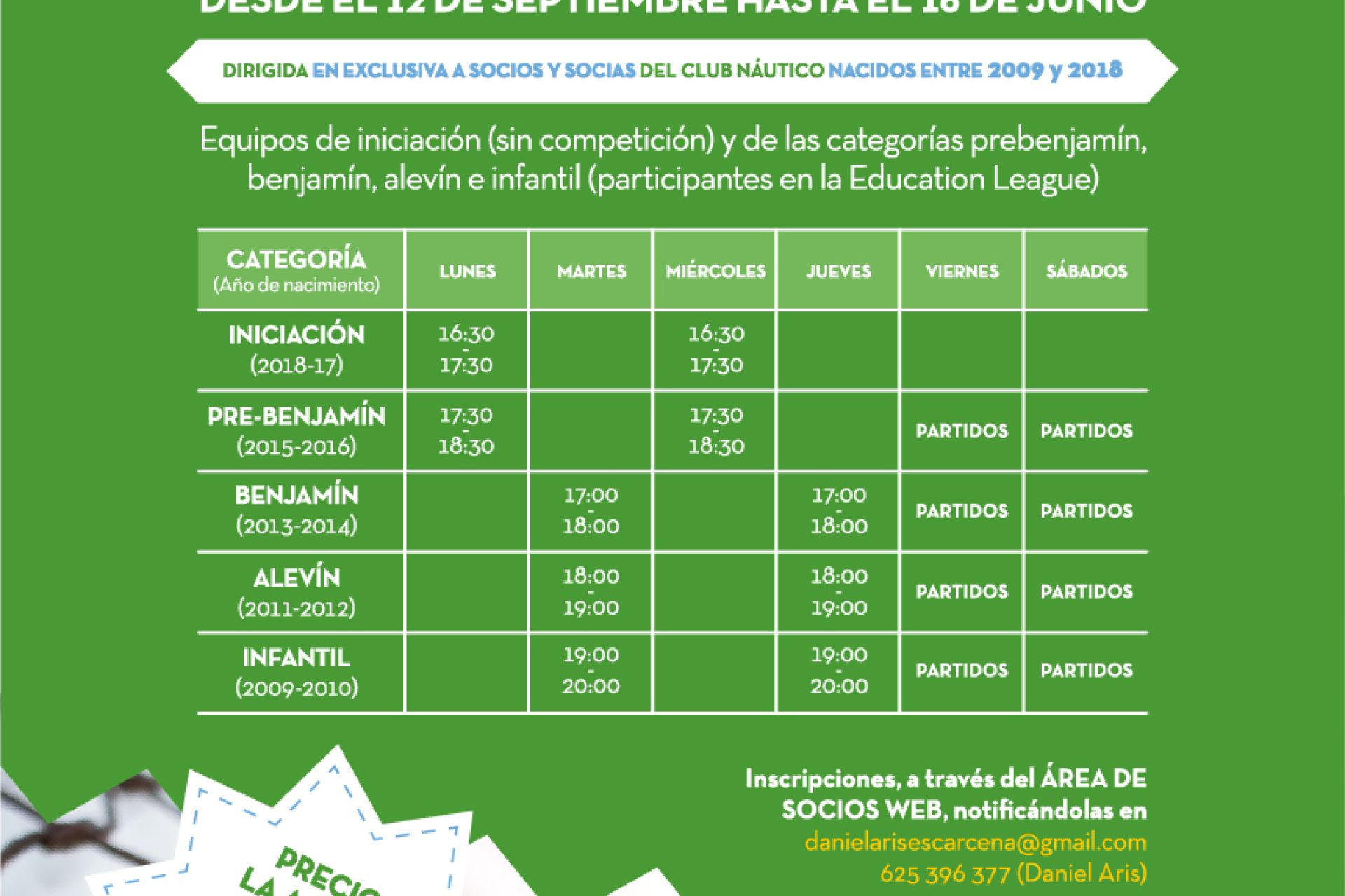 Desde el 1 de octubre, actividad exclusiva para socios y socias nacidos/as entre los años 2010 y 2016. Equipos de iniciación y las categorías prebenjamín, benjamín y alevín. Inscripciones (matrícula 20€, con equipación incluida), a través del ÁREA DE SOCIOS WEB
