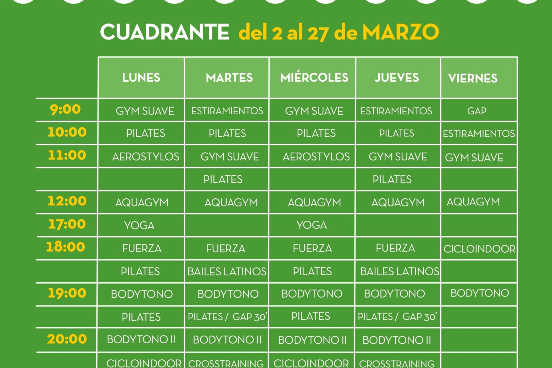De lunes a viernes de 9:00 a 22:00 horas, clases de Pilates, estiramientos, aerostylos, gimnasia suave, aquagym, bailes latinos, entreno funcional, yoga, cicloindoor, bodytono, GAP y crosstraining. En Semana Santa, sólo de lunes a miércoles de 10:00 13:00 h.