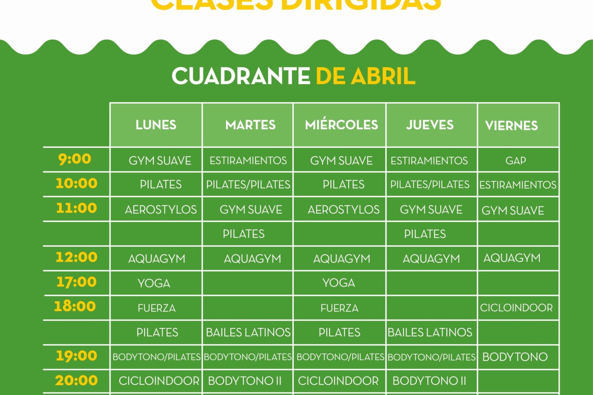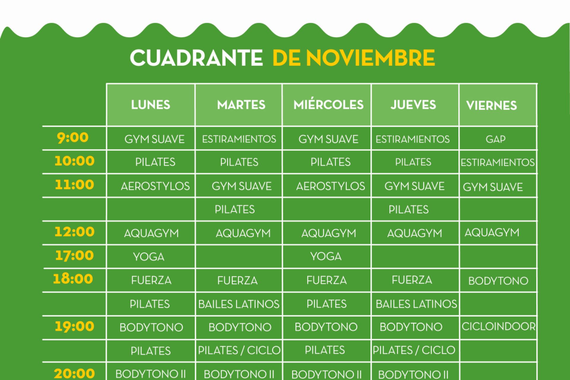 De lunes a viernes de 9:00 a 21:30 horas, clases de Pilates, estiramientos, aerostylos, aquagym, yoga, gimnasia suave, bailes latinos, cicloindoor, bodytono, GAP, fuerza y crosstraining.