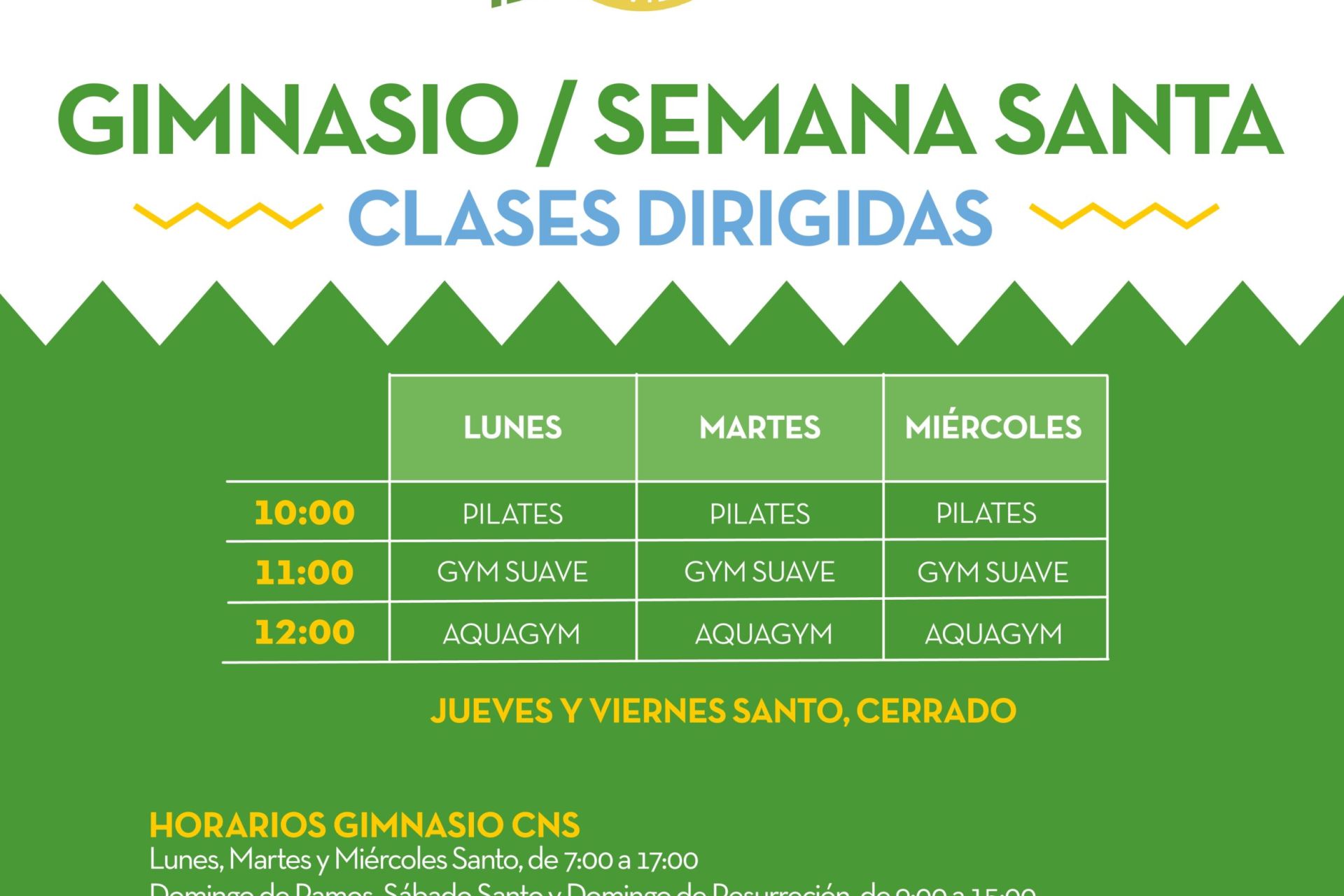 Clases programadas el Lunes, Martes y Miércoles Santo de 10:00 a 13:00 horas de Pilates, gimnasia suave y aquagym. Jueves y Viernes Santo, instalaciones cerradas.