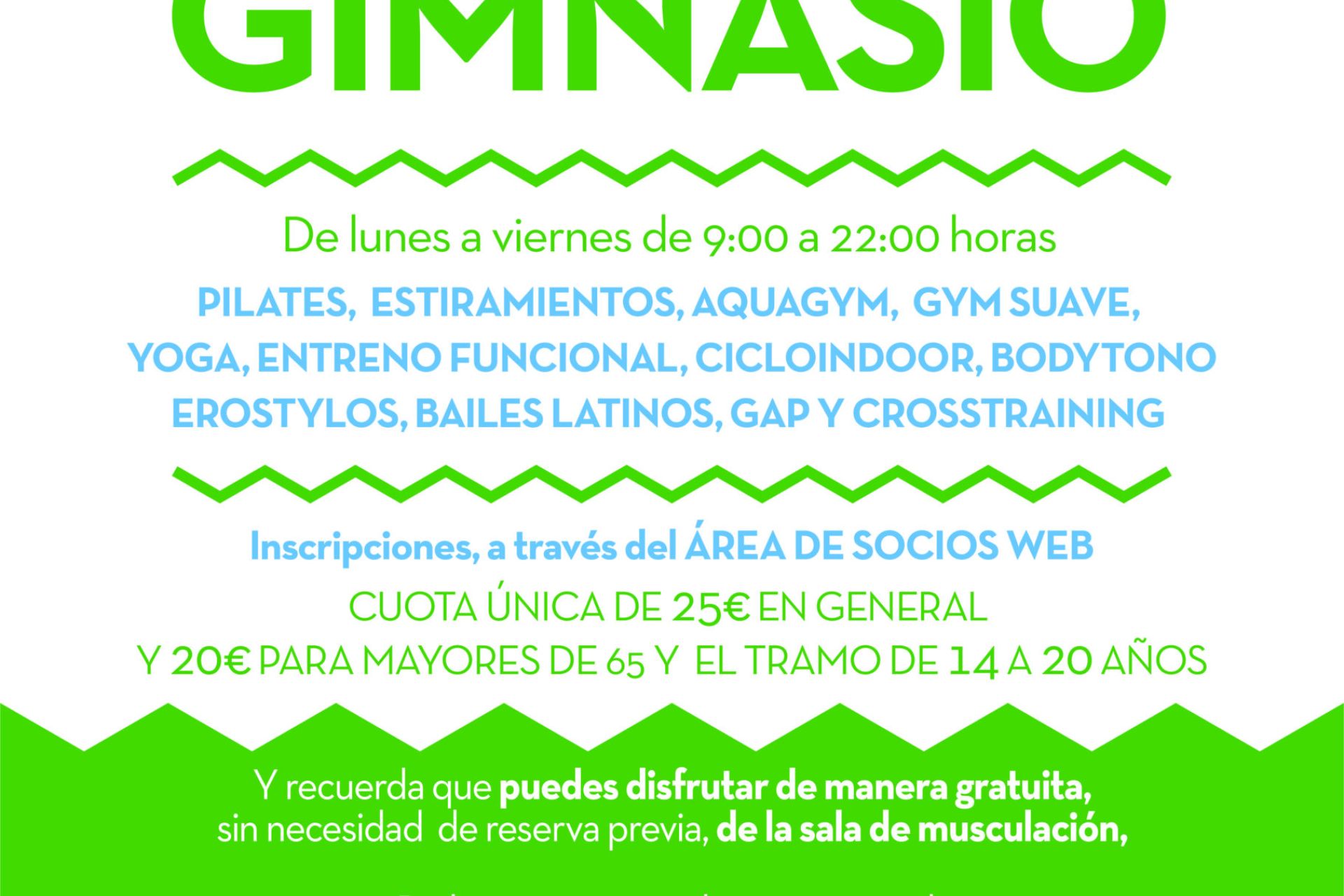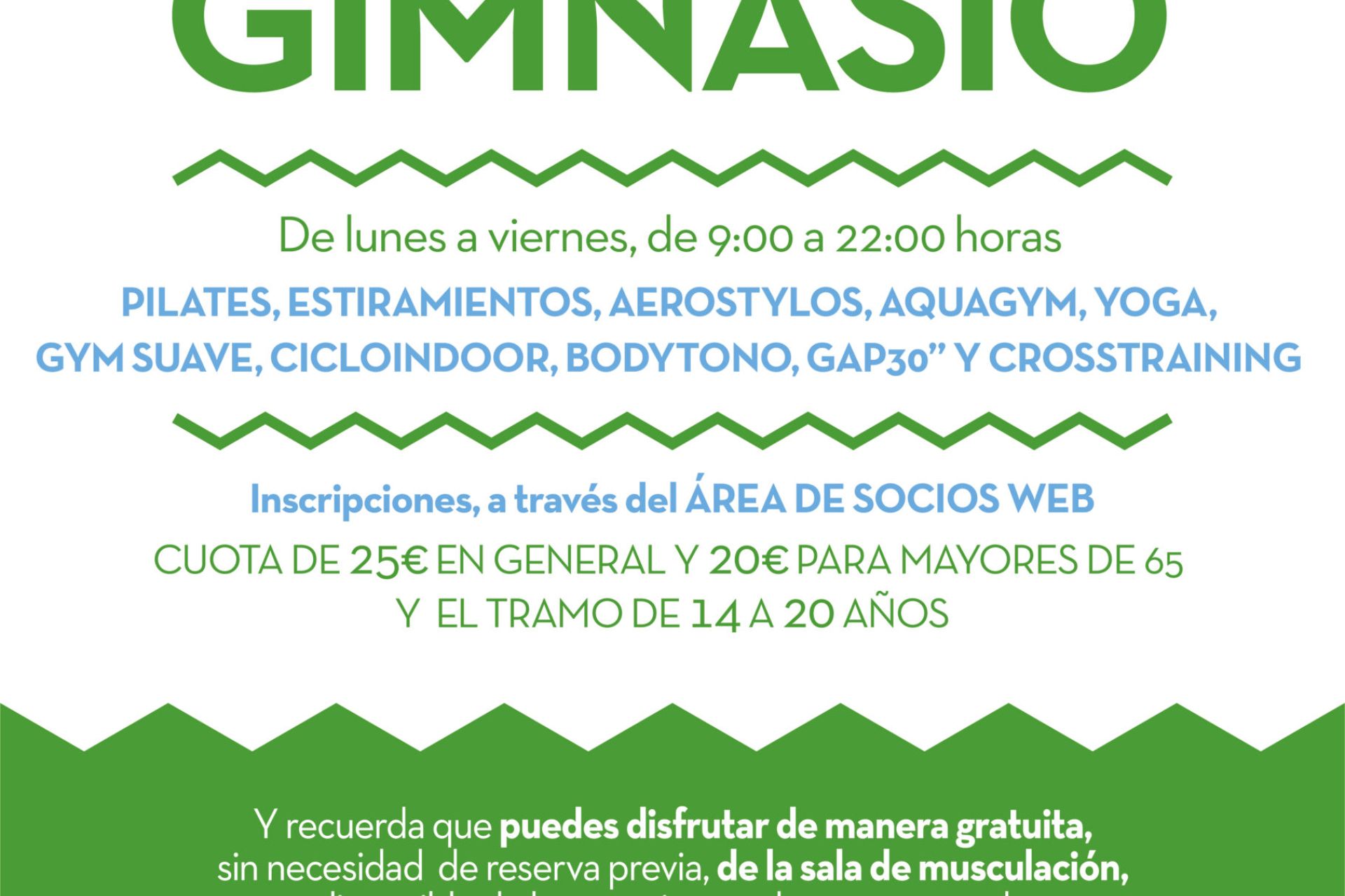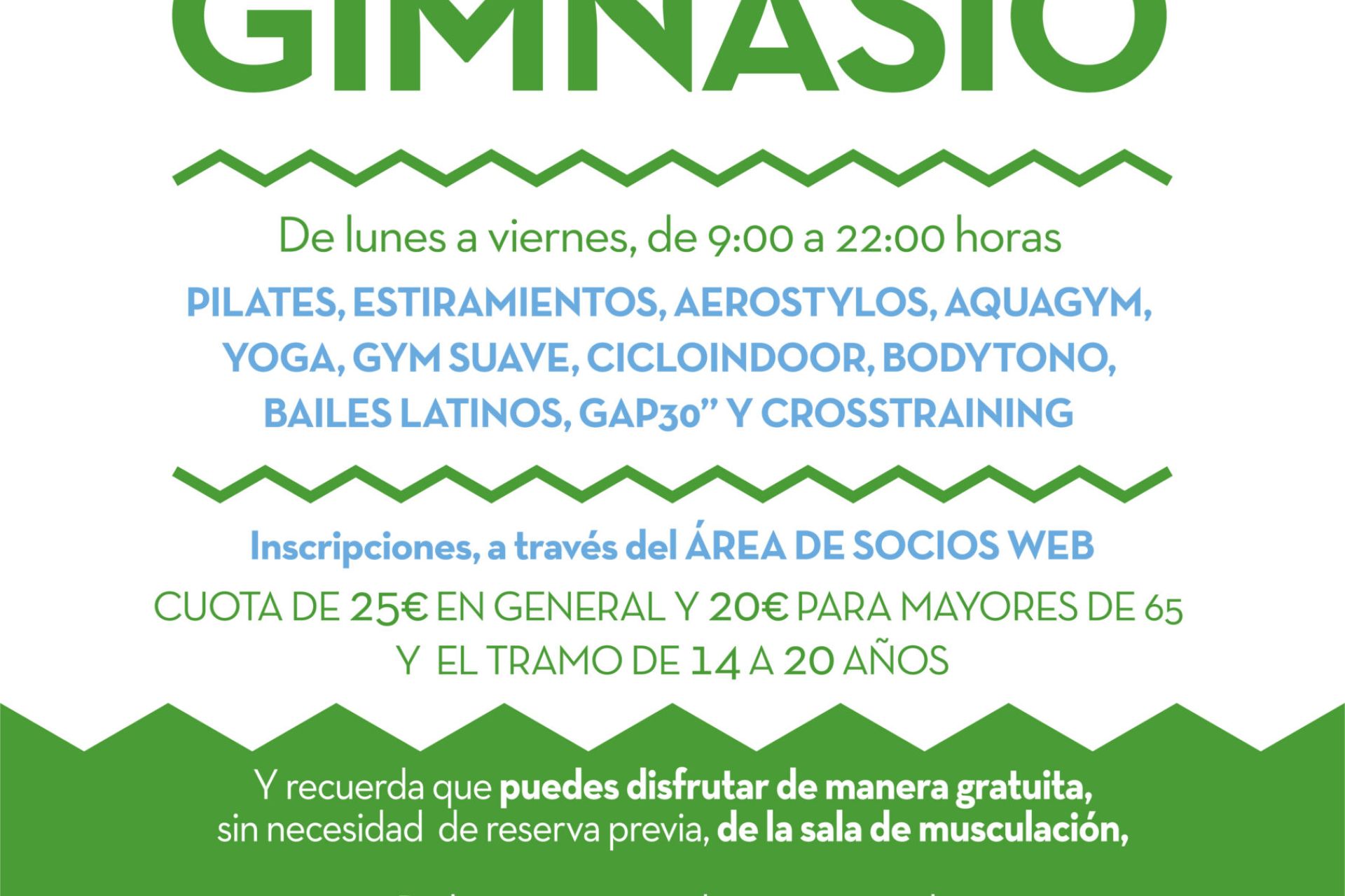 De lunes a viernes, de 9:00 a 22:00 horas, clases de Pilates, estiramientos, aerostylos, gym suave, aquagym, bailes latinos, yoga, cicloindoor, bodytono, GAP y crosstraining. Inscripciones, sin limitaciones y durante los 15 días previos a la actividad, a través del ÁREA DE SOCIOS WEB, con cuota de 25€ en general y de 20€ para mayores de 65 años y el tramo de 14 a 20 años.