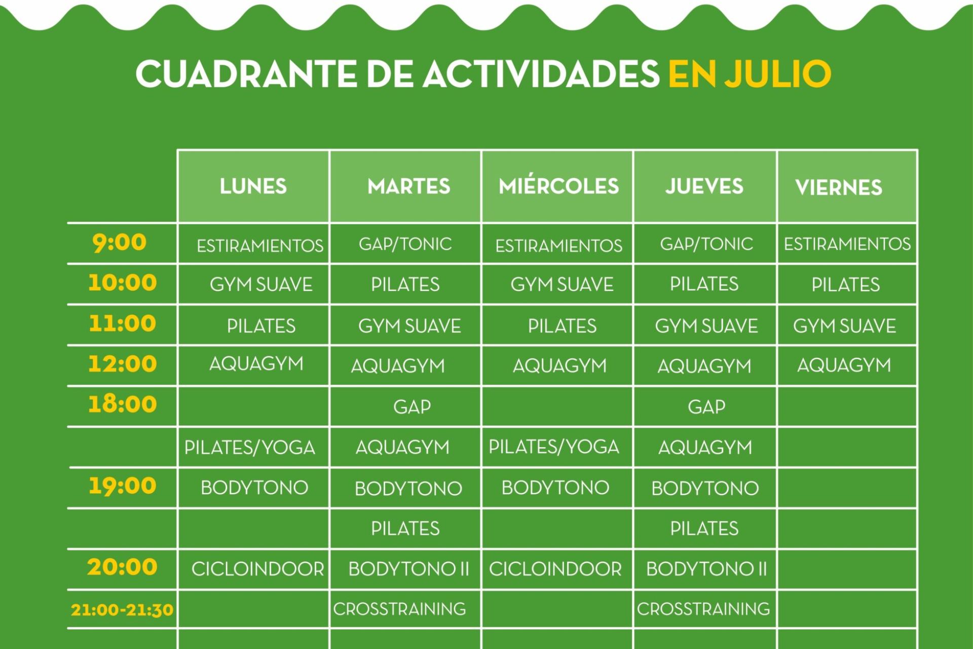 De lunes a jueves de 10:00 a 21:00 horas, clases de Pilates, gimnasia suave, aquagym, yoga, cicloindoor, bodytono y crosstraining. Inscripciones, a través del ÁREA DE SOCIOS WEB, con cuota única todo el verano (julio+agosto) de 25€ en general y 20€ para mayores de 65 años y el tramo de 14 a 20 años, reservando las actividades por medio de la APP MyWellness hasta 15 días antes, sin ninguna limitación de clases.