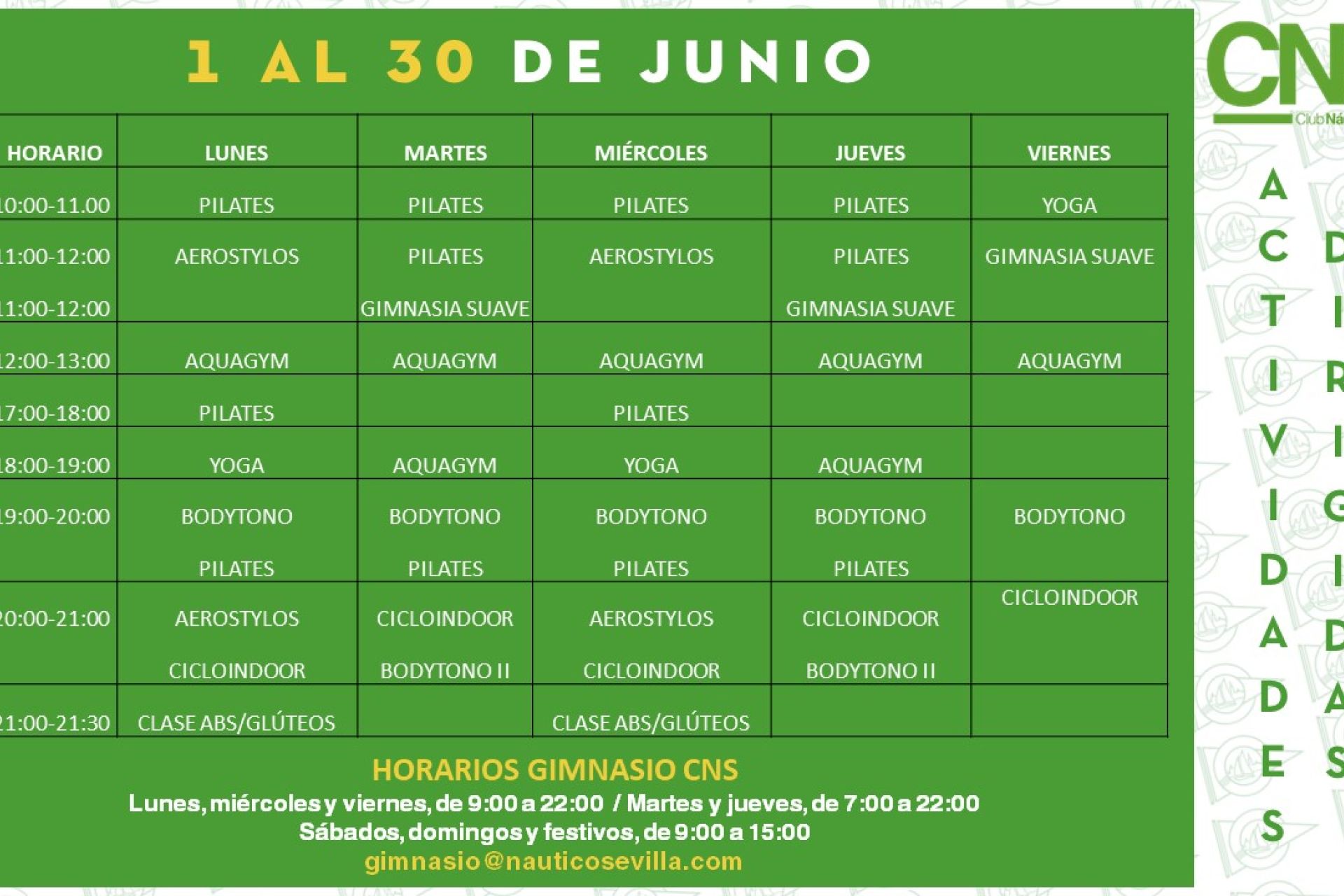A partir del 5 de septiembre, de lunes a jueves de 10:00 a 21:00 horas, clases de Pilates, aerostylos, gym suave, aquagym, yoga, cicloindoor, bodytono y GAP 30".