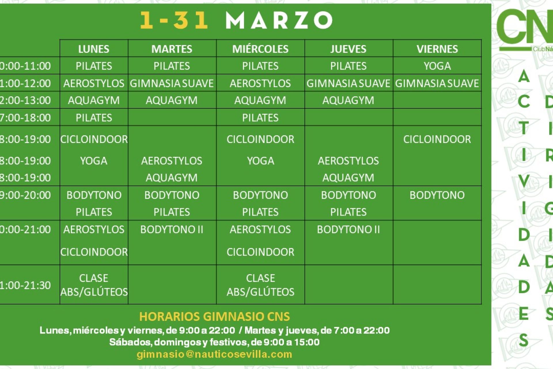Actividades dirigidas del gimnasio del 1 al 31 de marzo