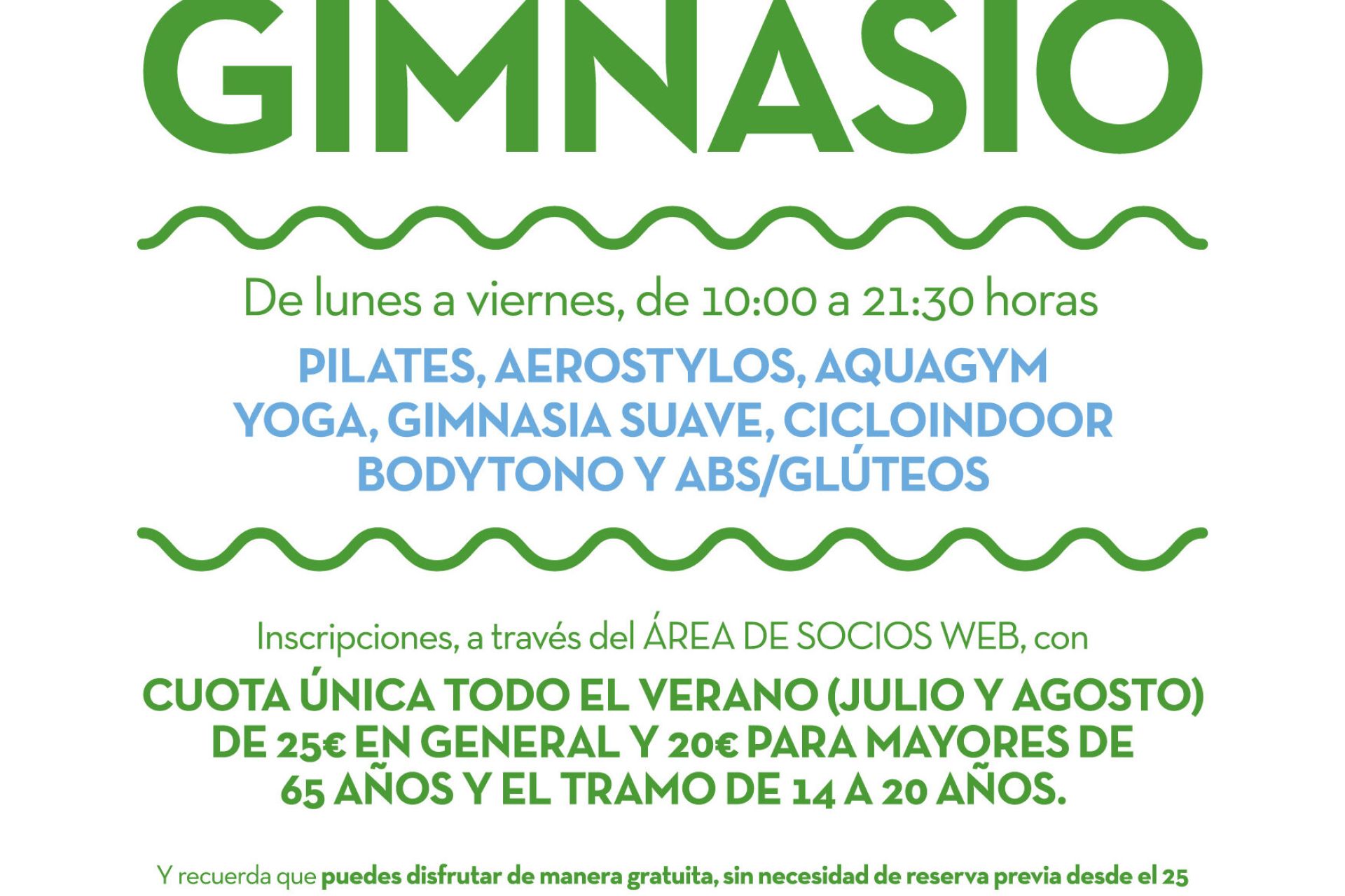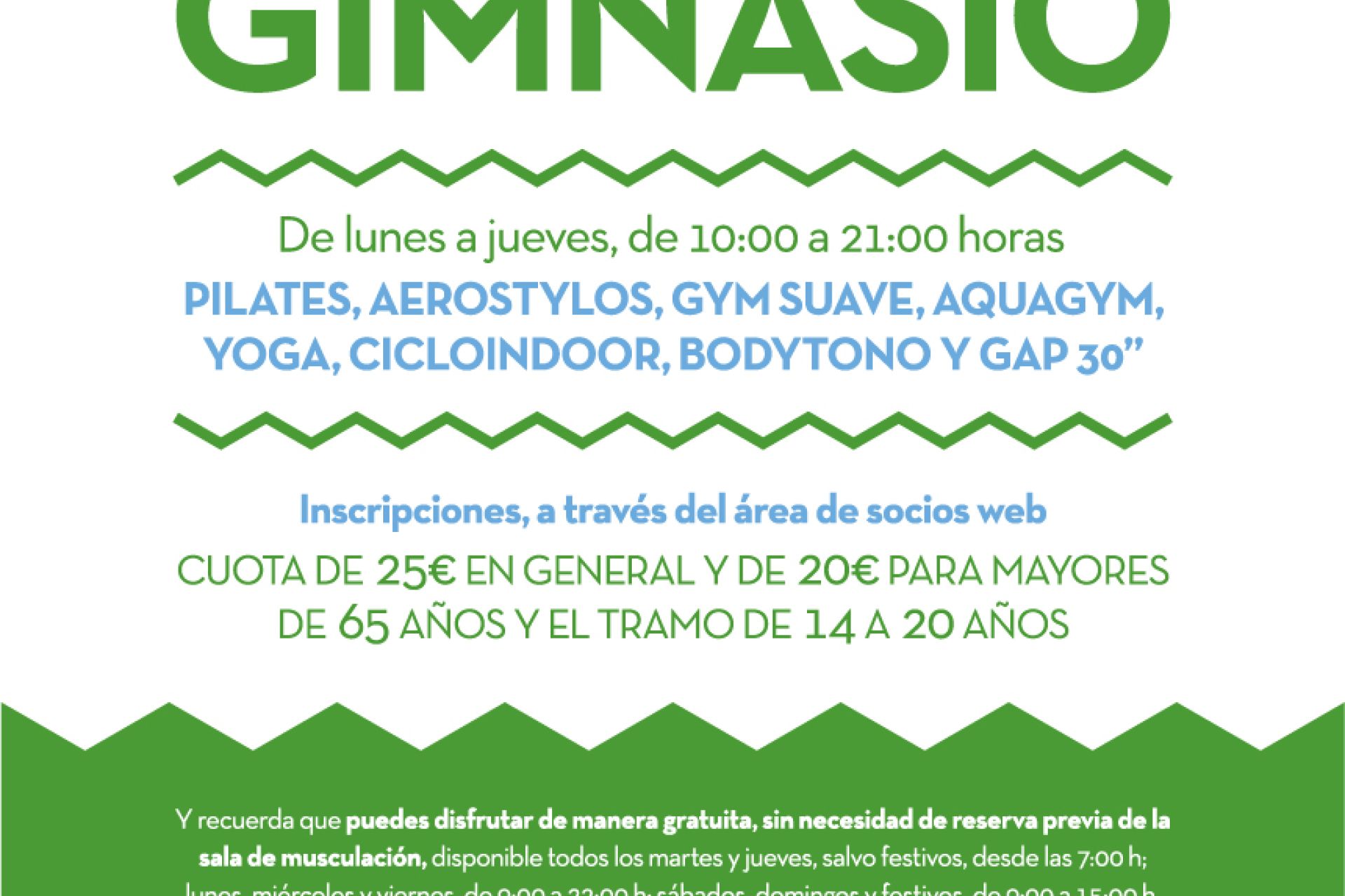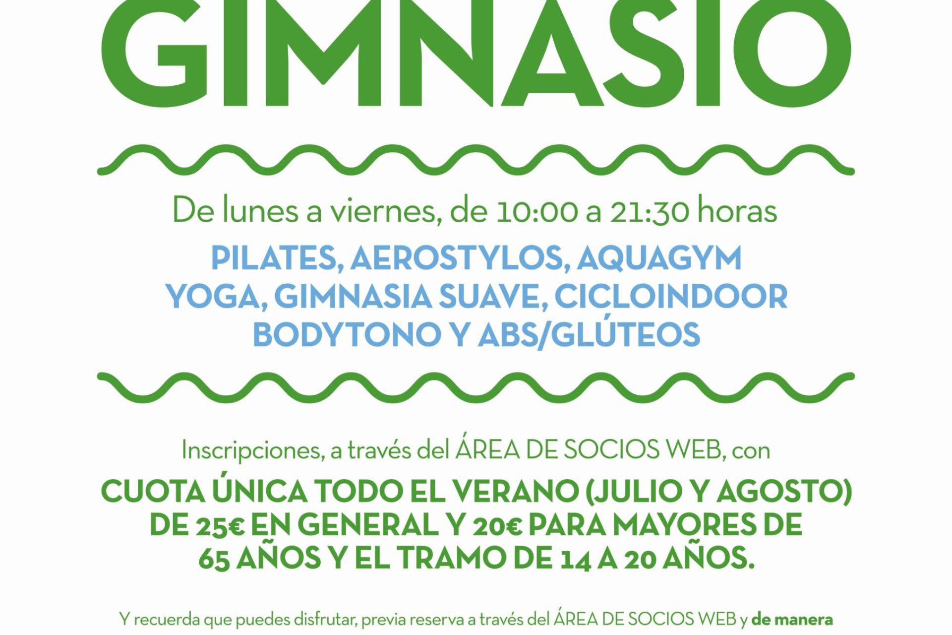 De lunes a viernes, de 10:00 a 21:30 horas, clases de Pilates, aerostylos, aquagym, yoga, gimnasia suave, cicloindoor, bodytono y ABS/glúteos. Inscripciones, a través del ÁREA DE SOCIOS WEB, con cuota única de 25€ en general y 20€ para mayores de 65 años y el tramo de 14 a 20 años.