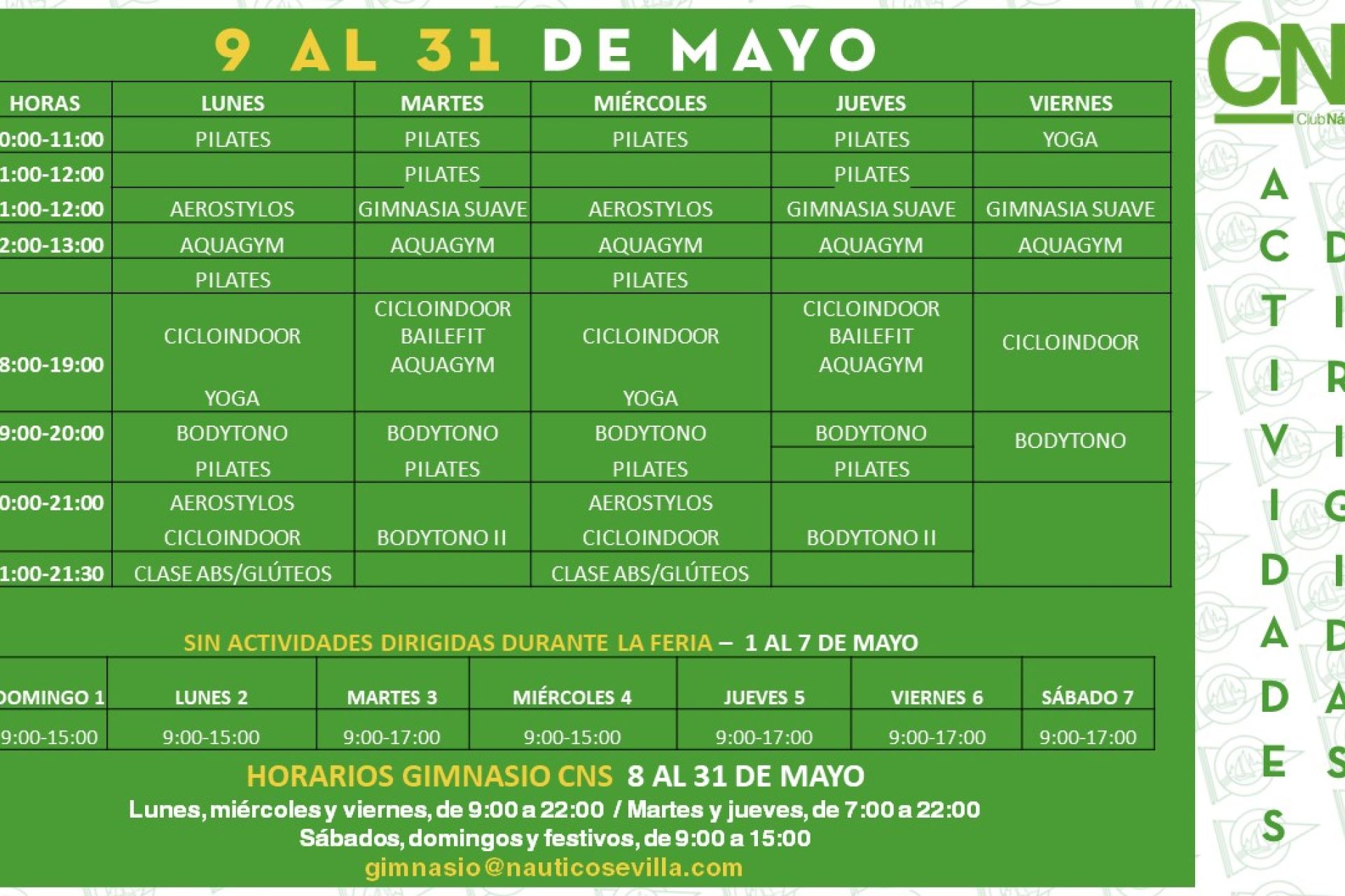 De lunes a viernes, de 10:00 a 21:30 horas, clases de Pilates, aerostylos, aquagym, yoga, gimnasia suave, cicloindoor, bodytono, bailefit y ABS/glúteos. Durante la Feria, horario especial y sin actividades dirigidas.