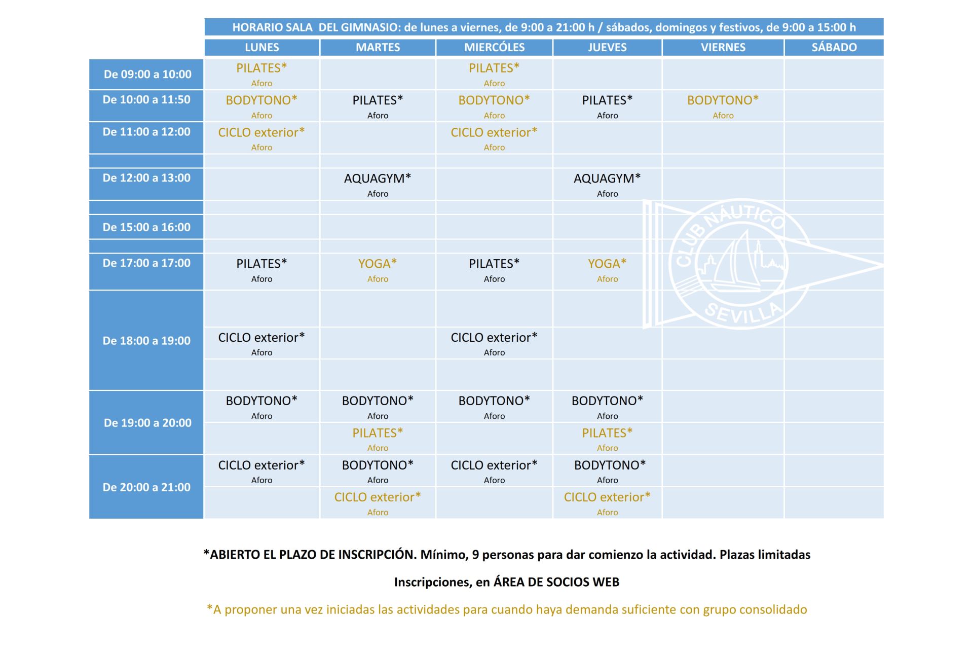 A través del ÁREA DE SOCIOS WEB, inscripciones abiertas para clases durante el mes de marzo de pilates, aquagym, spinning en exterior y bodytono. Mínimo, 9 personas para dar comienzo cada actividad. Plazas limitadas.