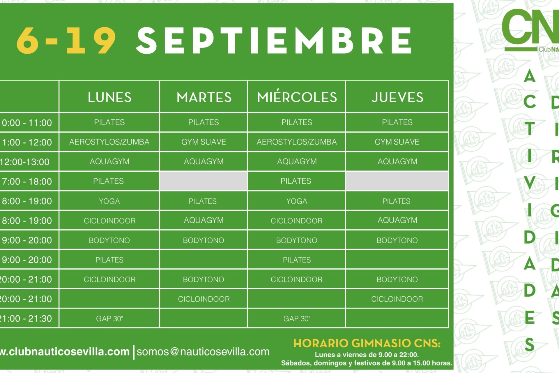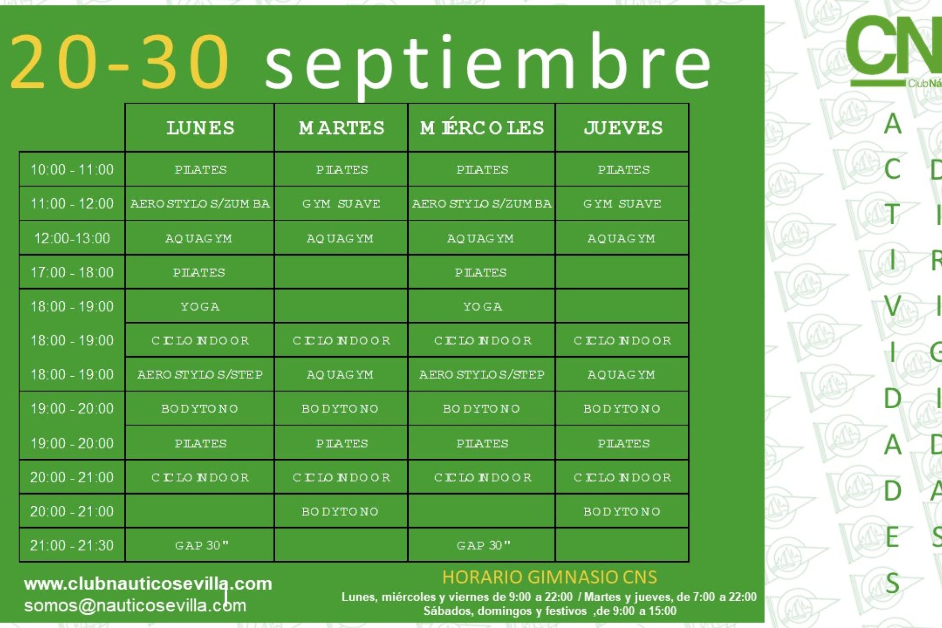 Cuadrante definitivo de actividades programadas en el AQA Club Náutico Fitness Center del 1 al 30 de septiembre de 2020.
