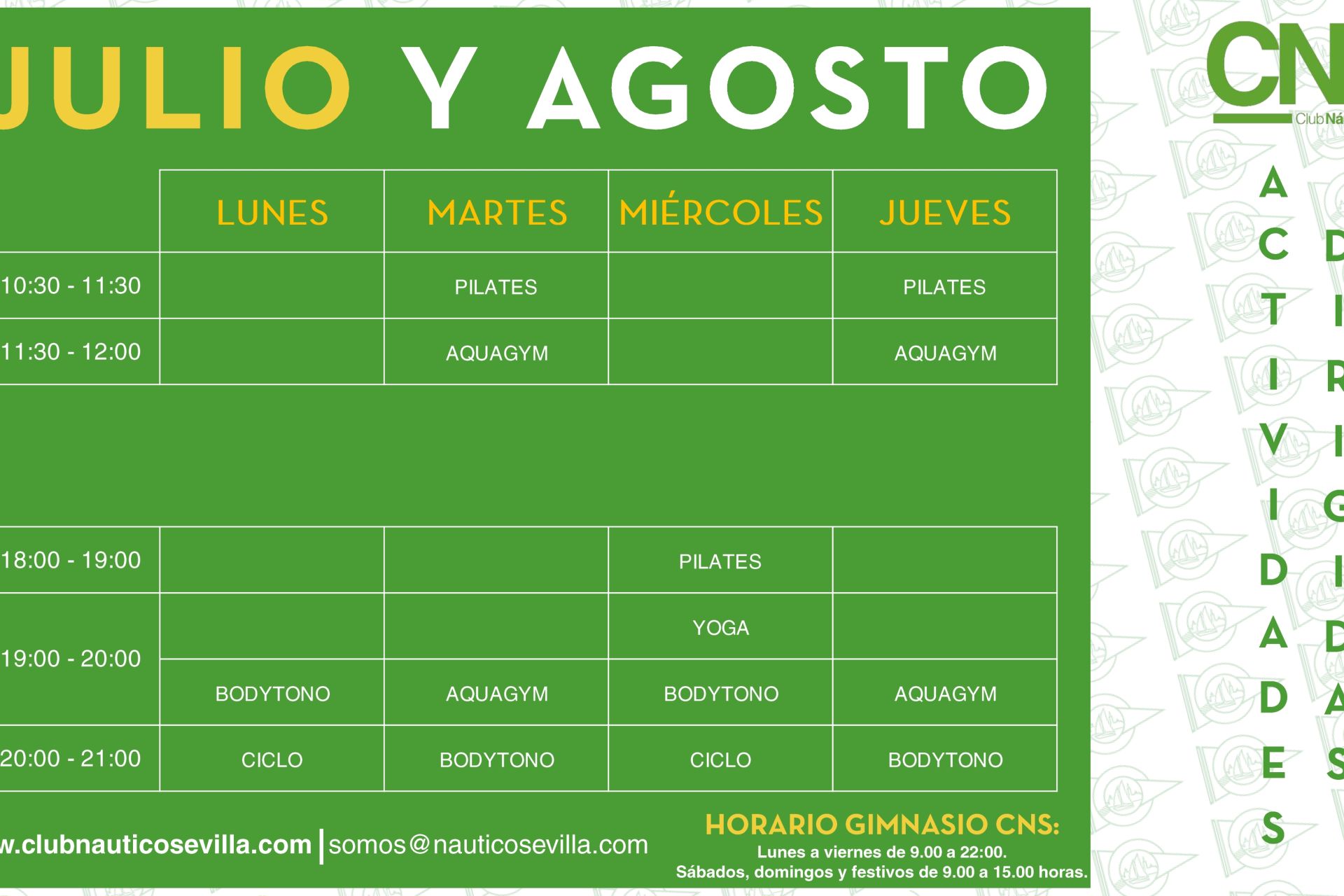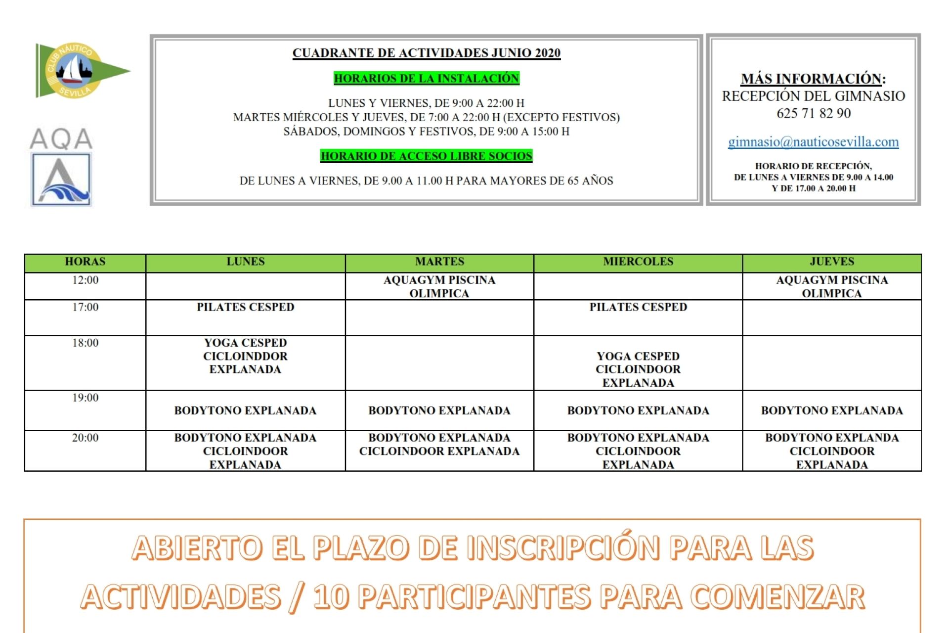 Horarios y actividades programadas en el AQA Club Náutico Fitness Center del 1 al 31 de julio de 2020.