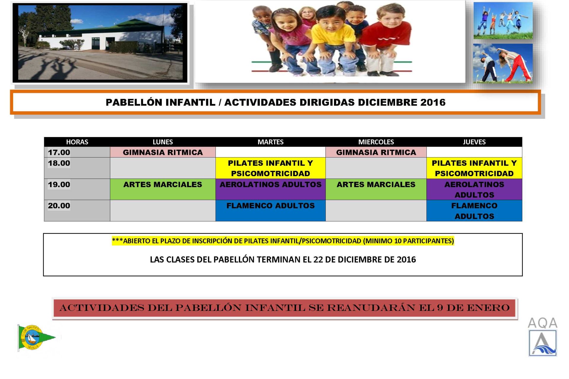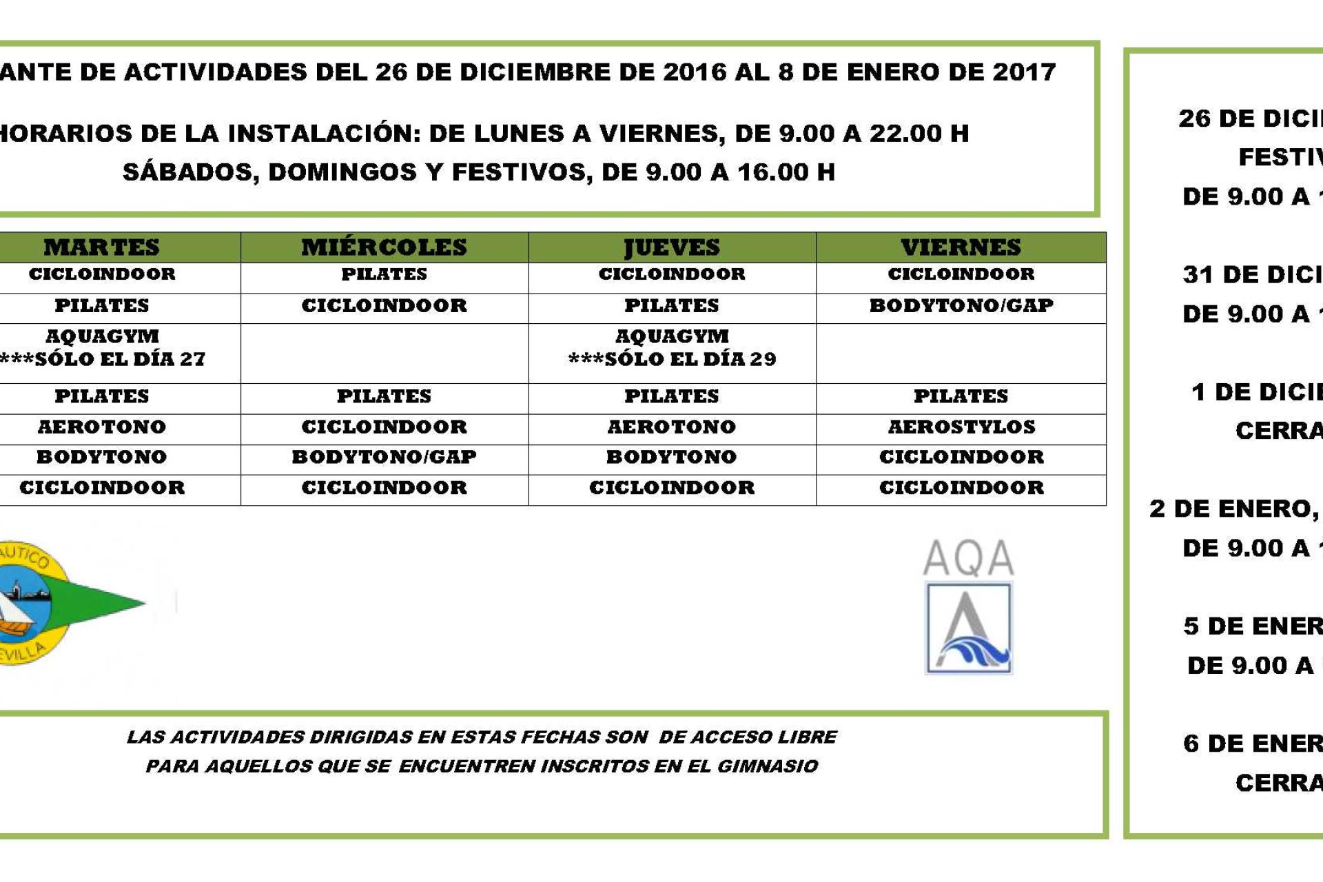 Actividades / horarios del gimnasio del 26 de diciembre al 8 de enero