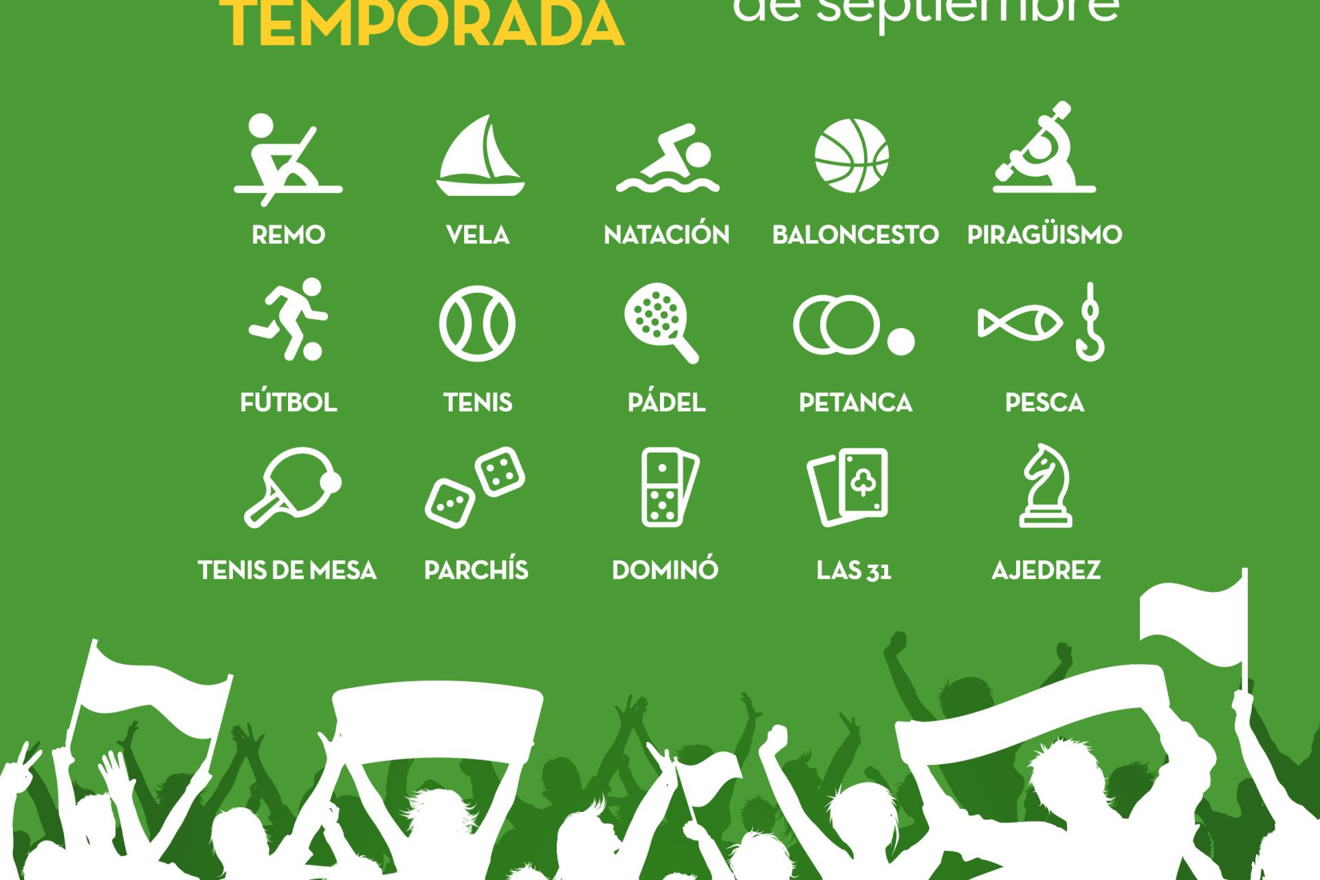 Del 1 al 29 de septiembre, ven y participa en las competiciones sociales programadas en un total de 14 modalidades (remo, vela, natación, baloncesto, piragüismo, fútbol, tenis, pádel, petanca, pesca, tenis de mesa, parchís, dominó y las 31) y cuyas fechas de celebración se irán concretando durante los próximos días.