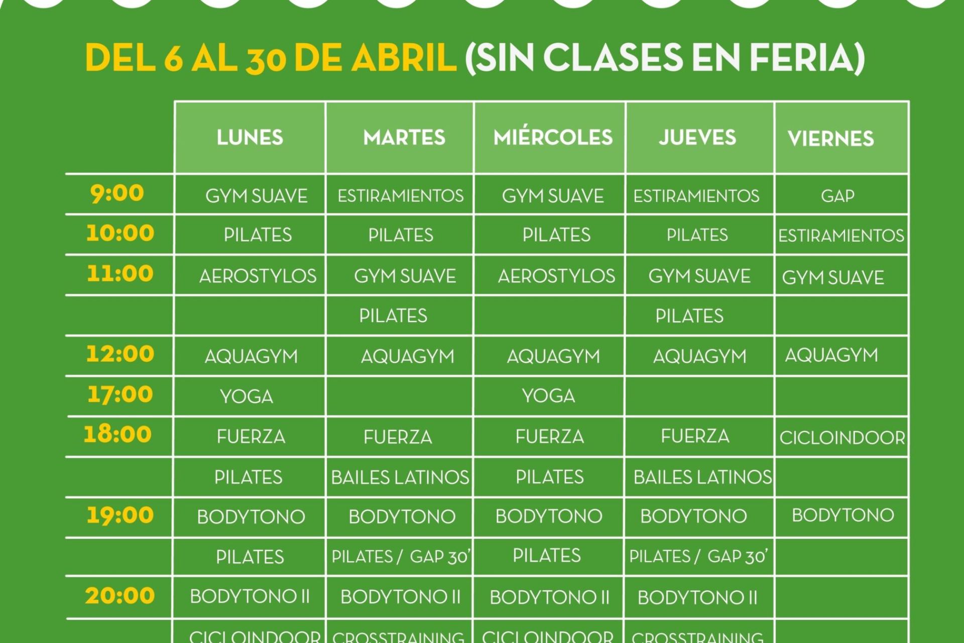 Excepto en Feria (sin clases del 20 al 26 de abril), de lunes a viernes de 9:00 a 21:30 h clases de Pilates, estiramientos, aerostylos, aquagym, yoga, gimnasia suave, bailes latinos, cicloindoor, bodytono, GAP, fuerza y crosstraining.