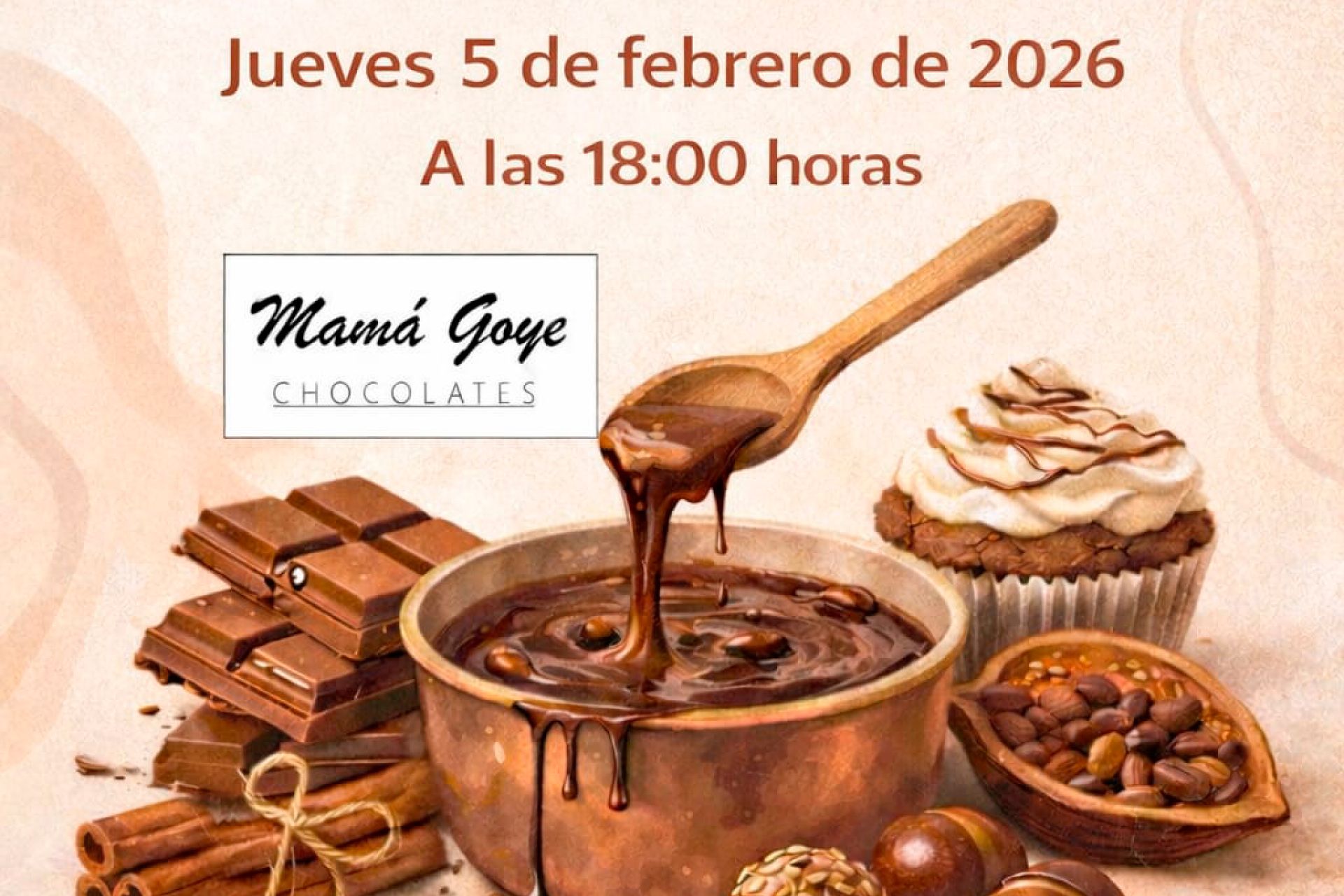 El jueves 5 de febrero a las 18:00 h, actividad dirigida a todas las edades organizada en colaboración con Chocolates Mamá Goye. Reserva de plazas (11€), limitadas a 40 personas, a través del Área de socios web.