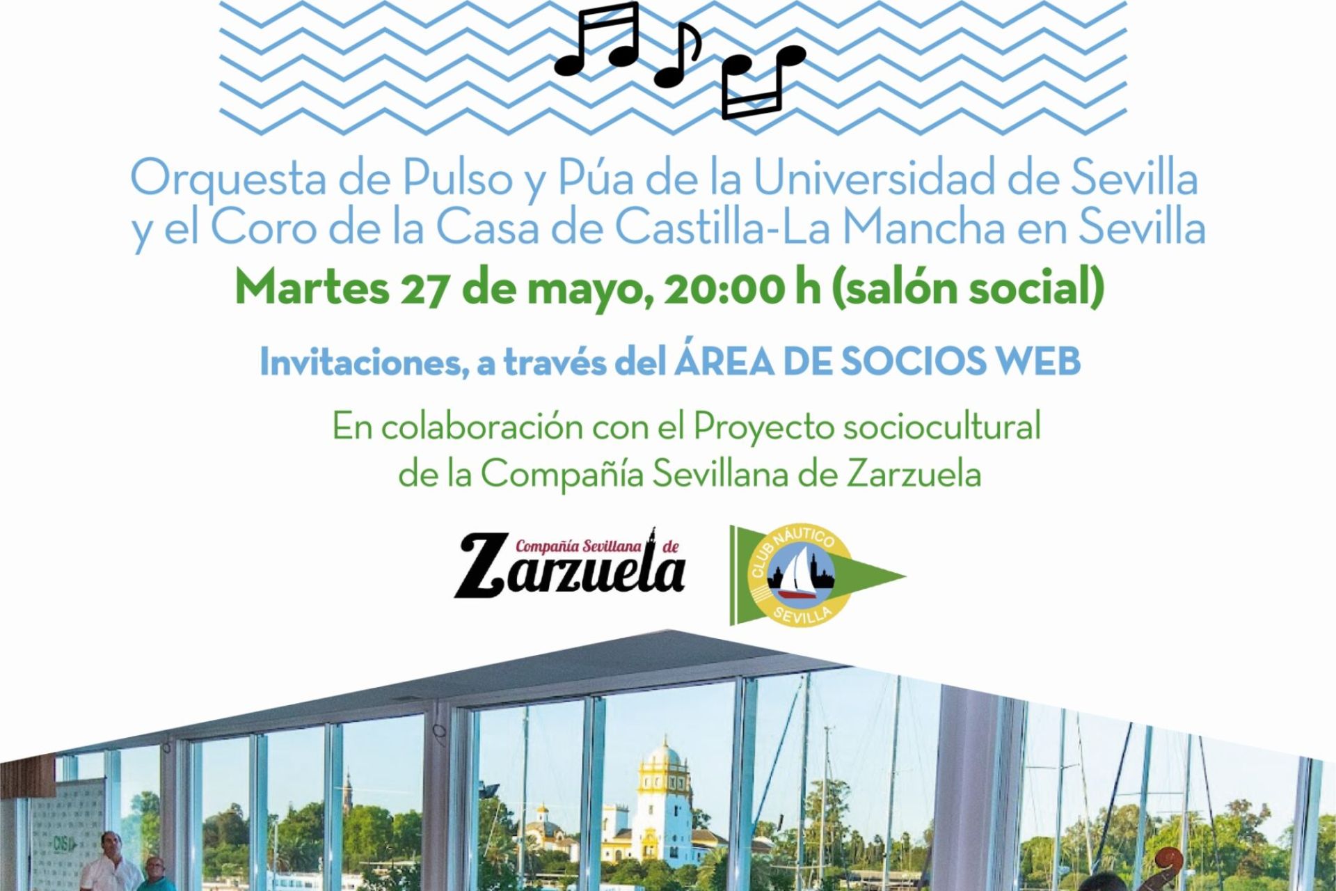 Este martes, 27 de mayo, a las 20:00 horas en el salón social, concierto de la Orquesta de Pulso y Púa de la Universidad de Sevilla y el Coro de la Casa de Castilla-La Mancha de Sevilla, en colaboración con el Proyecto sociocultural de la Compañía Sevillana de Zarzuela.