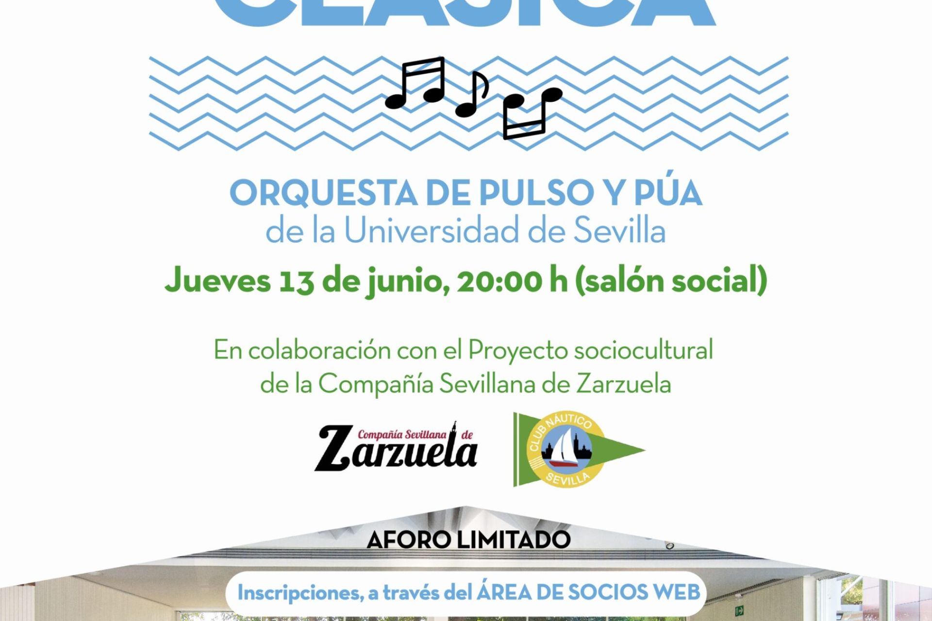 Recital de la Orquesta de Pulso y Púa de la Universidad de Sevilla a celebrar, con la colaboración del Proyecto sociocultural de la Compañía Sevillana de Zarzuela, el jueves 13 de junio a las 20:00 h en el salón social. Inscripciones, a través del ÁREA DE SOCIOS WEB (inscripción en clases). Aforo limitado.