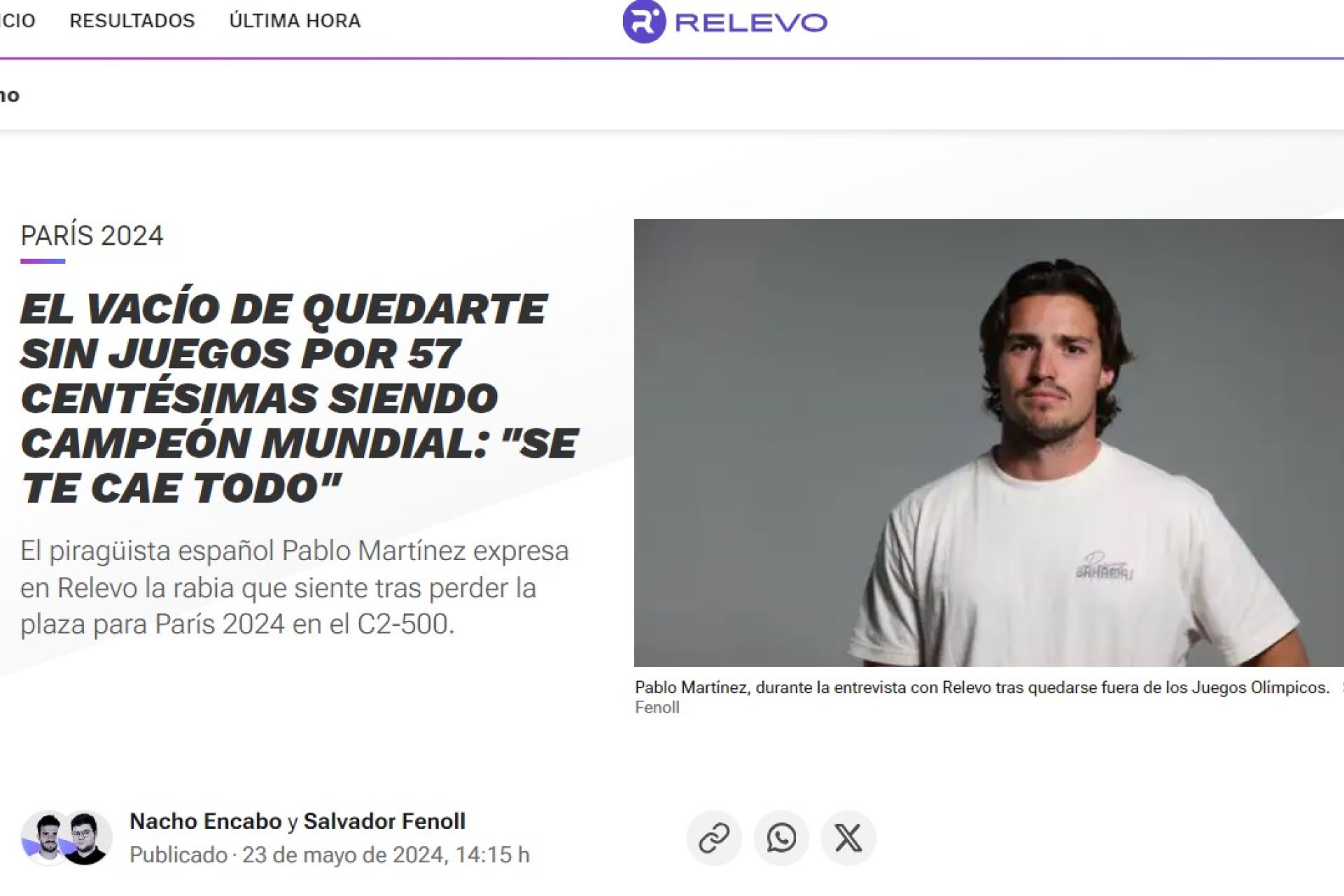 El Socio de Honor del Club Náutico Sevilla Pablo Martínez expresa en el diario 'Relevo' la rabia que siente tras perder la plaza para París 2024 en el C2 500.