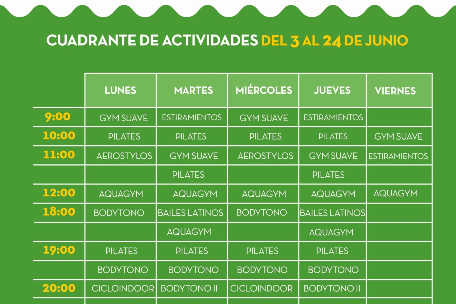 De lunes a viernes de 9:00 a 21:00 horas, clases de Pilates, estiramientos, aerostylos, gimnasia suave, aquagym, bailes latinos, yoga, cicloindoor, bodytono, GAP y crosstraining.