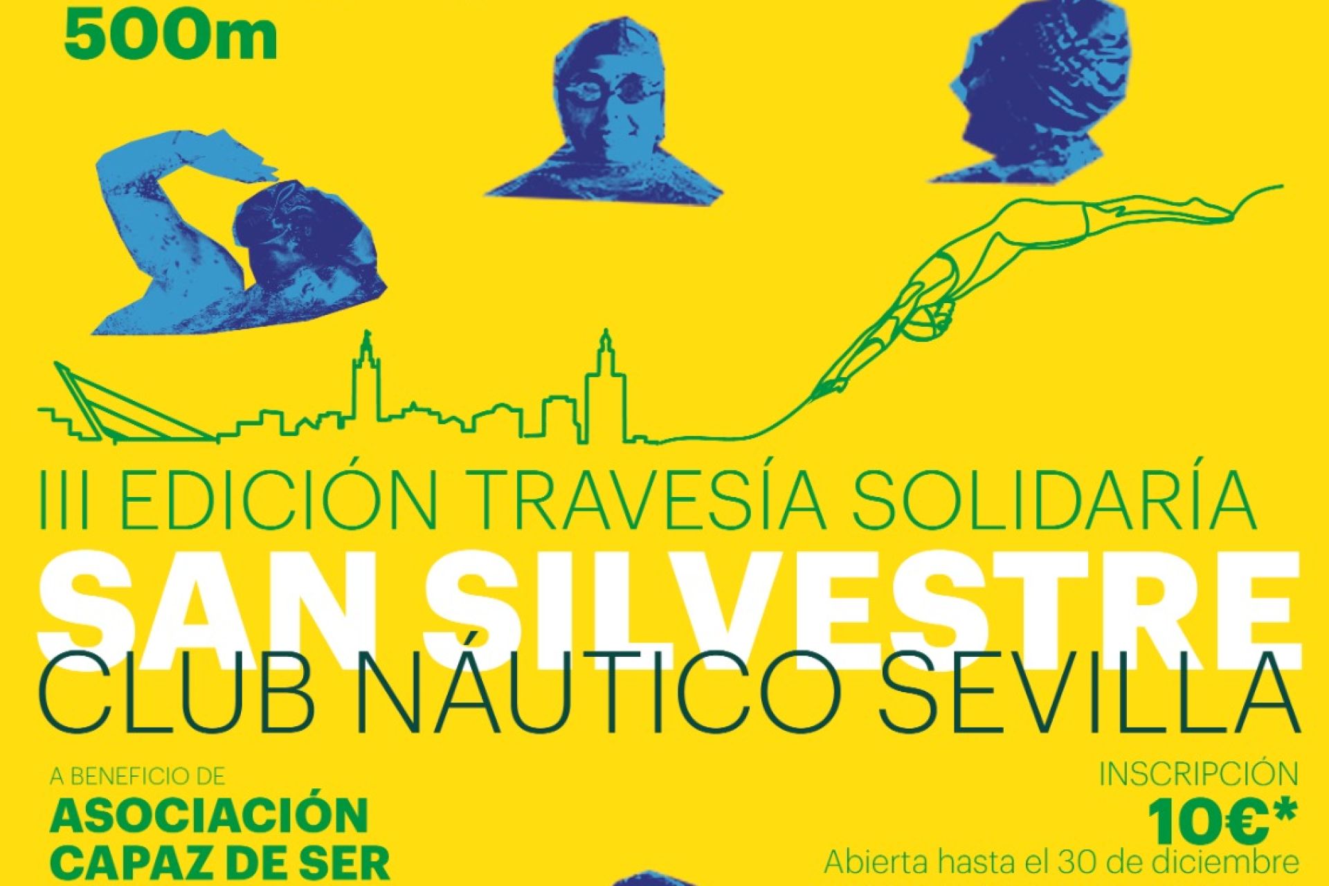 Abierto el plazo de inscripción (10€, incluyendo bolsa del nadador) para la tercera edición de una cita programada en la matinal del 31 de diciembre en la dársena del Guadalquivir sobre 500 metros a beneficio de la asociación Capaz de ser