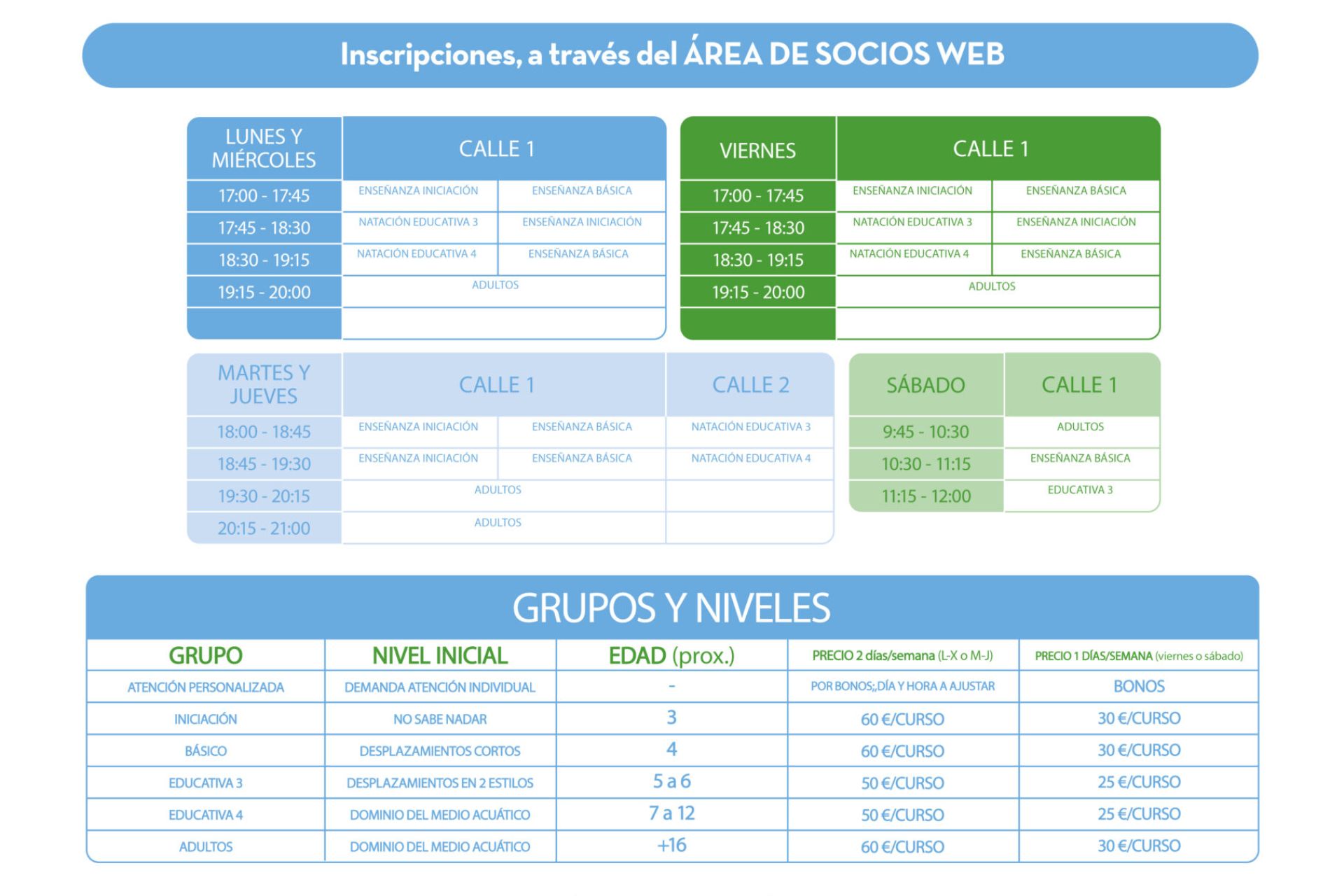 De lunes a viernes, de 9:00 a 22:00 horas, clases de Pilates, estiramientos, aerostylos, gym suave, aquagym, bailes latinos, yoga, cicloindoor, bodytono, GAP y crosstraining. Inscripciones, sin limitaciones y durante los 15 días previos a la actividad, a través del ÁREA DE SOCIOS WEB, con cuota de 25€ en general y de 20€ para mayores de 65 años y el tramo de 14 a 20 años.
