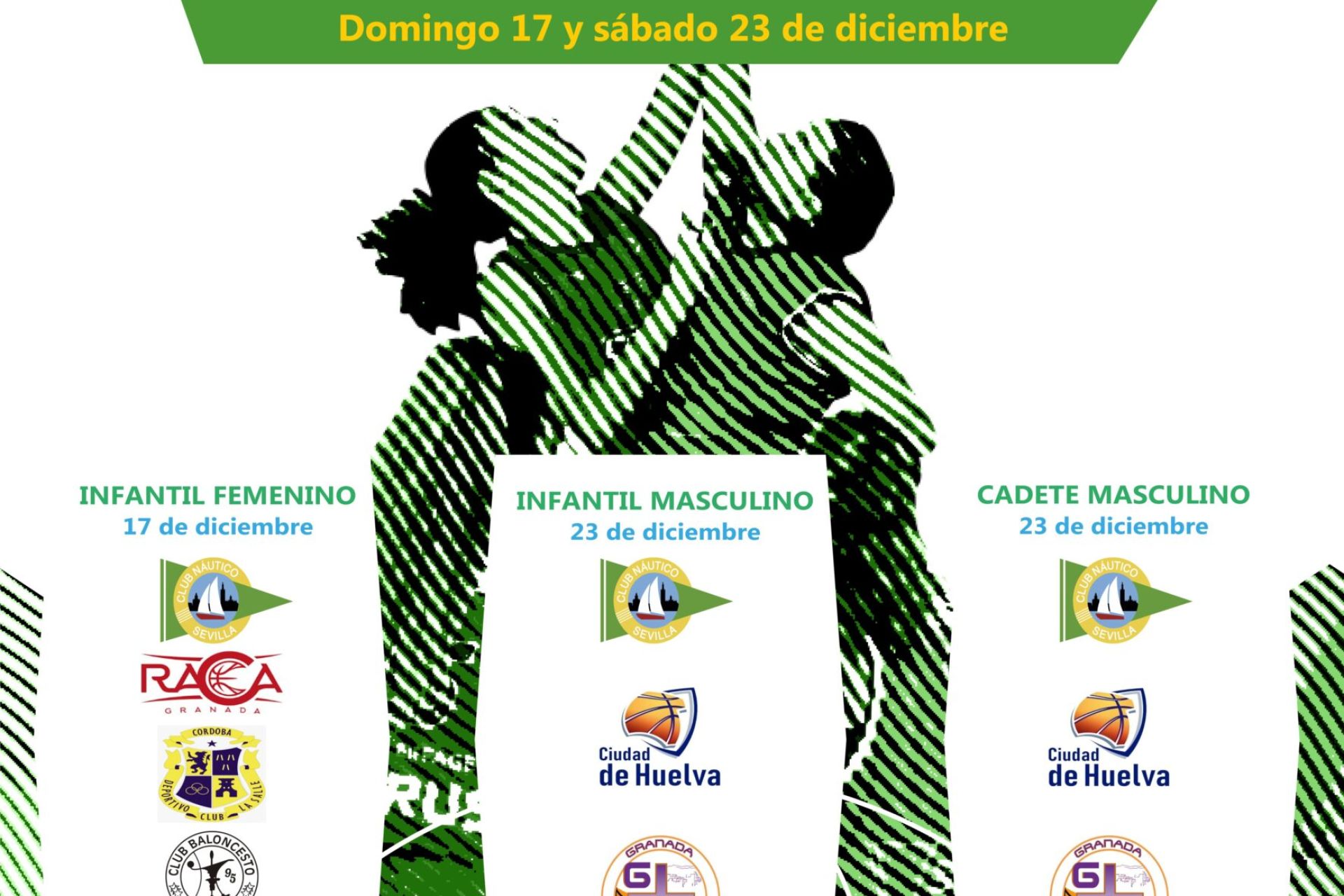 Competición programada los días 17 y 23 de diciembre en las categorías infantil masculina y femenina y cadete masculina con la visita al Club Náutico de RACA de Granada, los cordobeses Maristas y La Salle, C.B. La Palma, Ciudad de Huelva y Granada Baloncesto.