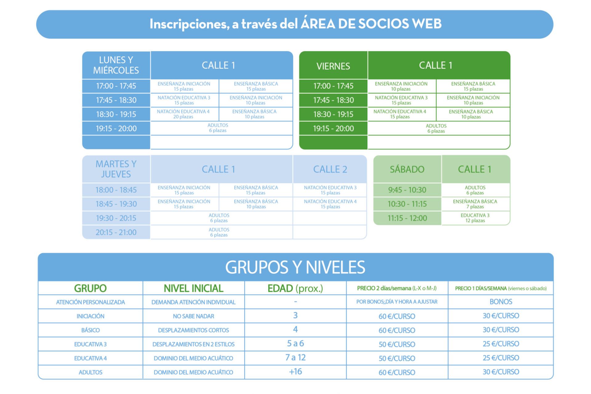 Cursos trimestrales de natación para todas las edades y niveles a celebrar del 16 de octubre al 22 de diciembre. Inscripciones, a través del ÁREA DE SOCIOS WEB. Se habilitará lista de espera en el caso de que se agoten las plazas para cubrir posibles vacantes.