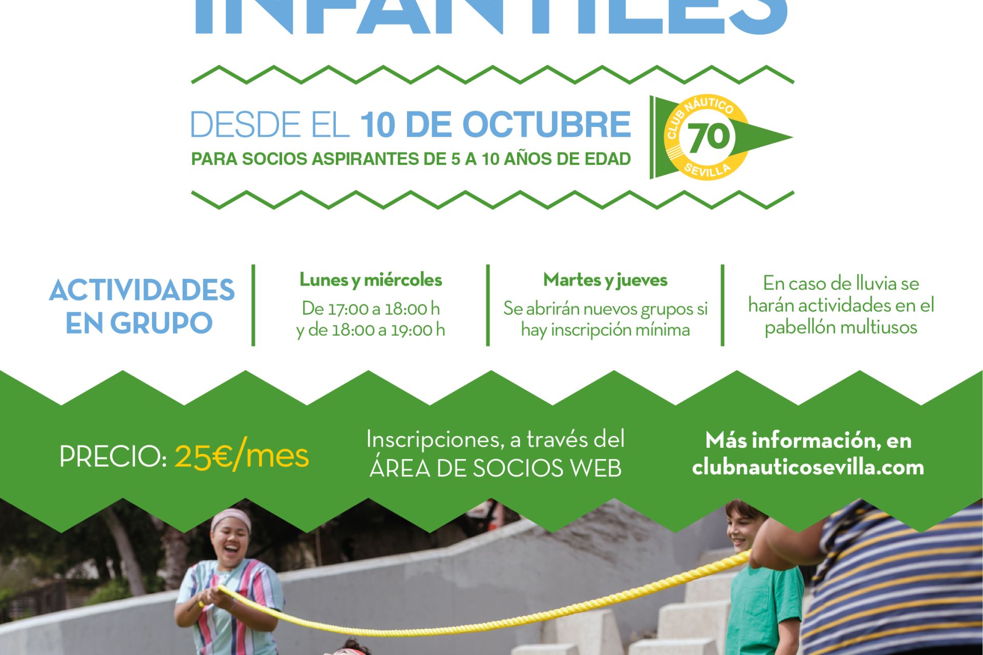 Desde el 10 de octubre, para socios aspirantes de 5 a 10 años de edad, a celebrar en grupo los lunes y miércoles de 17:00 a 18:00 y de 18:00 a 19:00 h. En caso de lluvia, se realizarán las actividades en el pabellón multiusos. Inscripciones, a través del ÁREA DE SOCIO WEB Precio, 25€/mes. Más en información, deporte@nauticosevilla.com