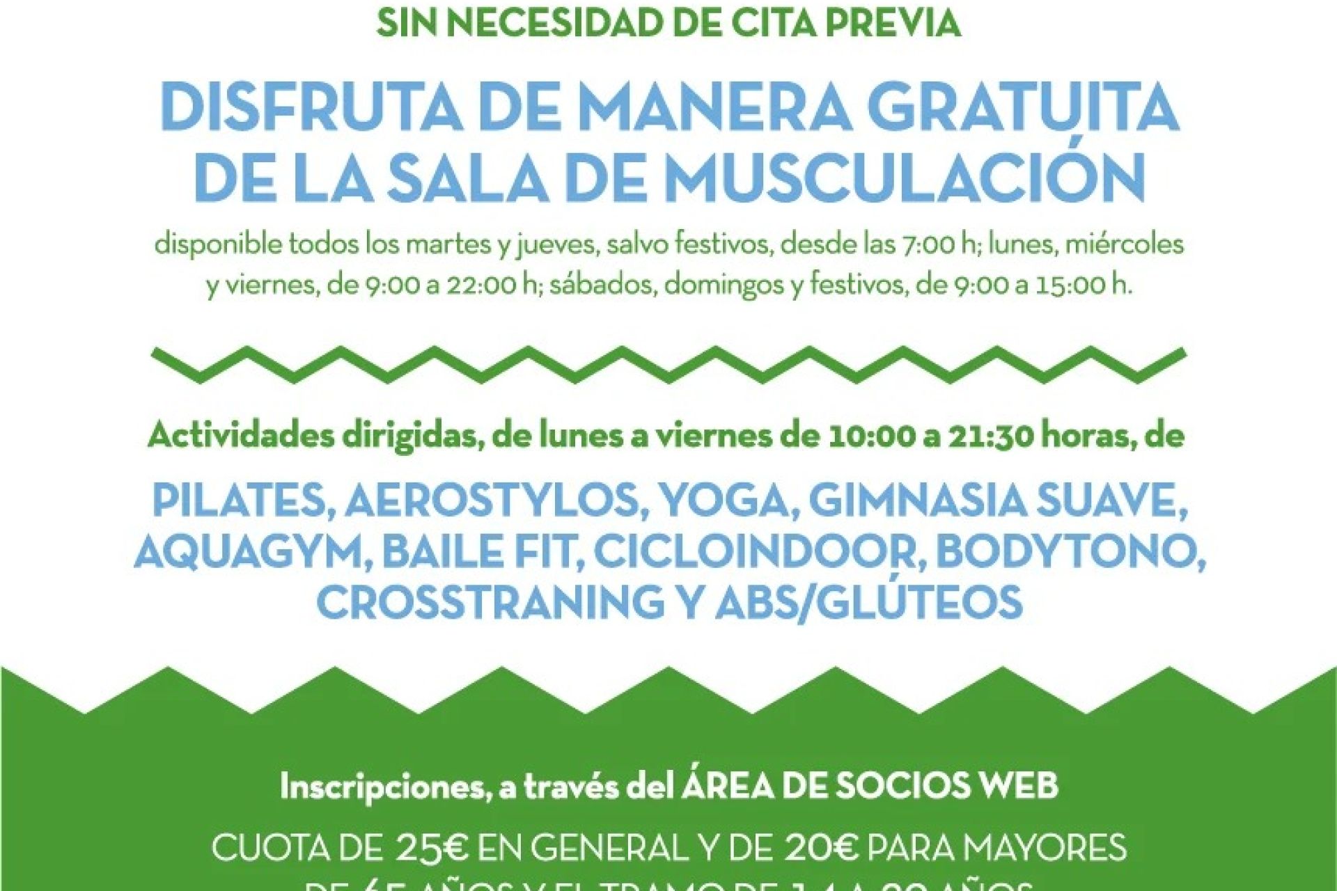 Disfruta de manera gratuita de la sala de musculación, sin necesidad de reserva previa, todos los martes y jueves, salvo festivos, desde las 7:00 h; lunes, miércoles y viernes, de 9:00 a 22:00 h; sábados, domingos y festivos, de 9:00 a 15:00 h.
