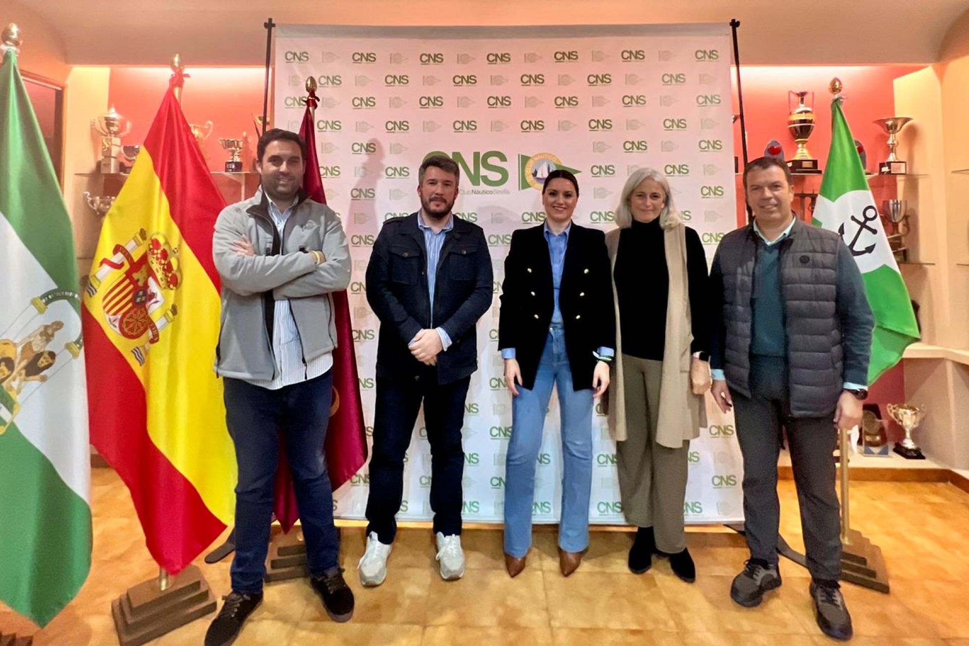 Minerva Salas, delegada territorial en Sevilla de la Junta de Andalucía, con la directiva del Club Náutico, "cuna de deportistas olímpicos y campeones del mundo": "Los clubes deportivos son fundamentales para el desarrollo y fomento del deporte y sus valores en Sevilla, y el Club Náutico es un gran ejemplo de ello".