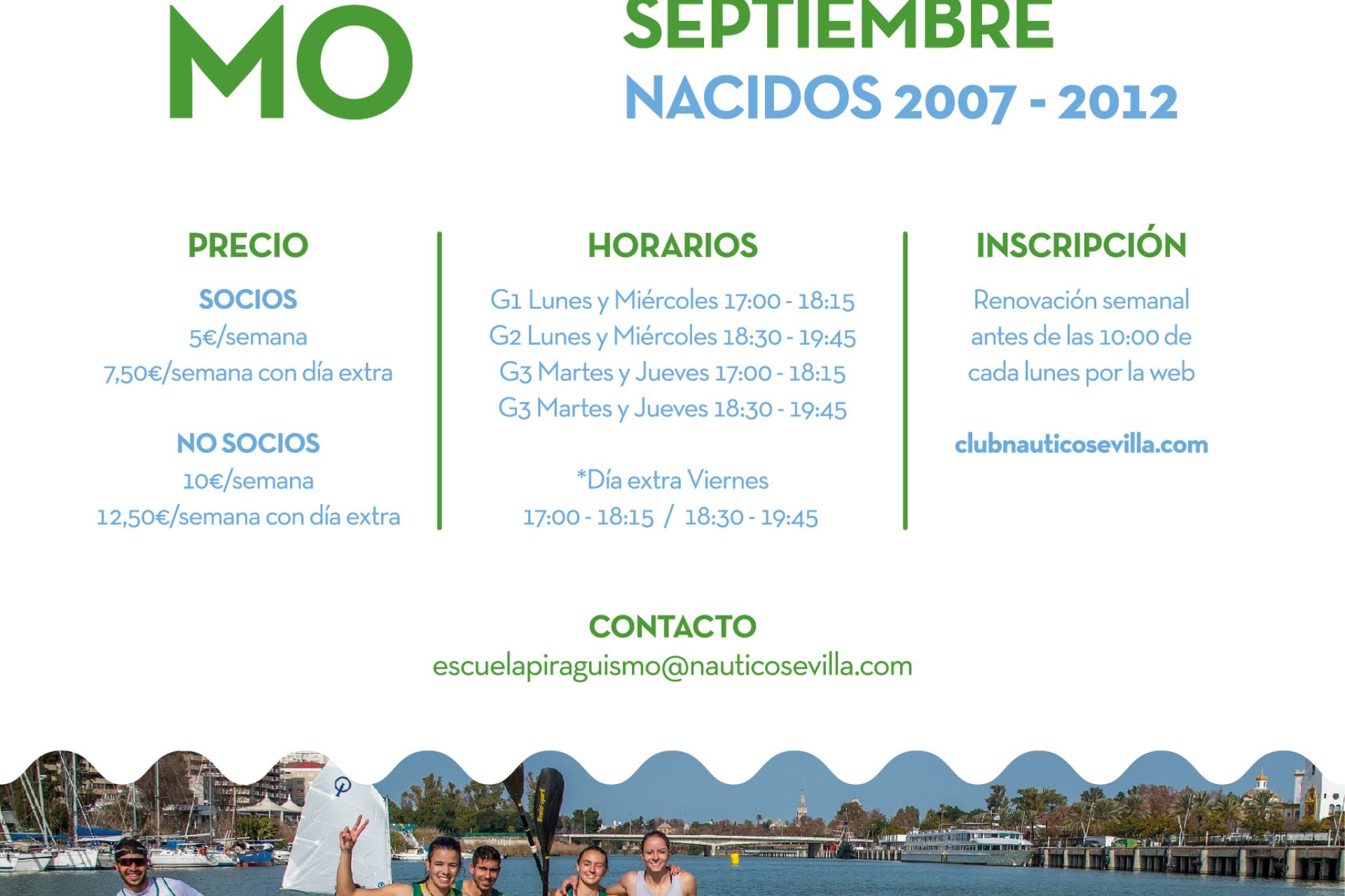 Cursos semanales dirigidos a socios y no socios nacidos entre los años 2007 y 2012, ambos inclusive, a celebrar en septiembre de lunes a viernes. Inscripciones, a través del FORMULARIO WEB disponible en clubnauticosevilla.com/piraguismo